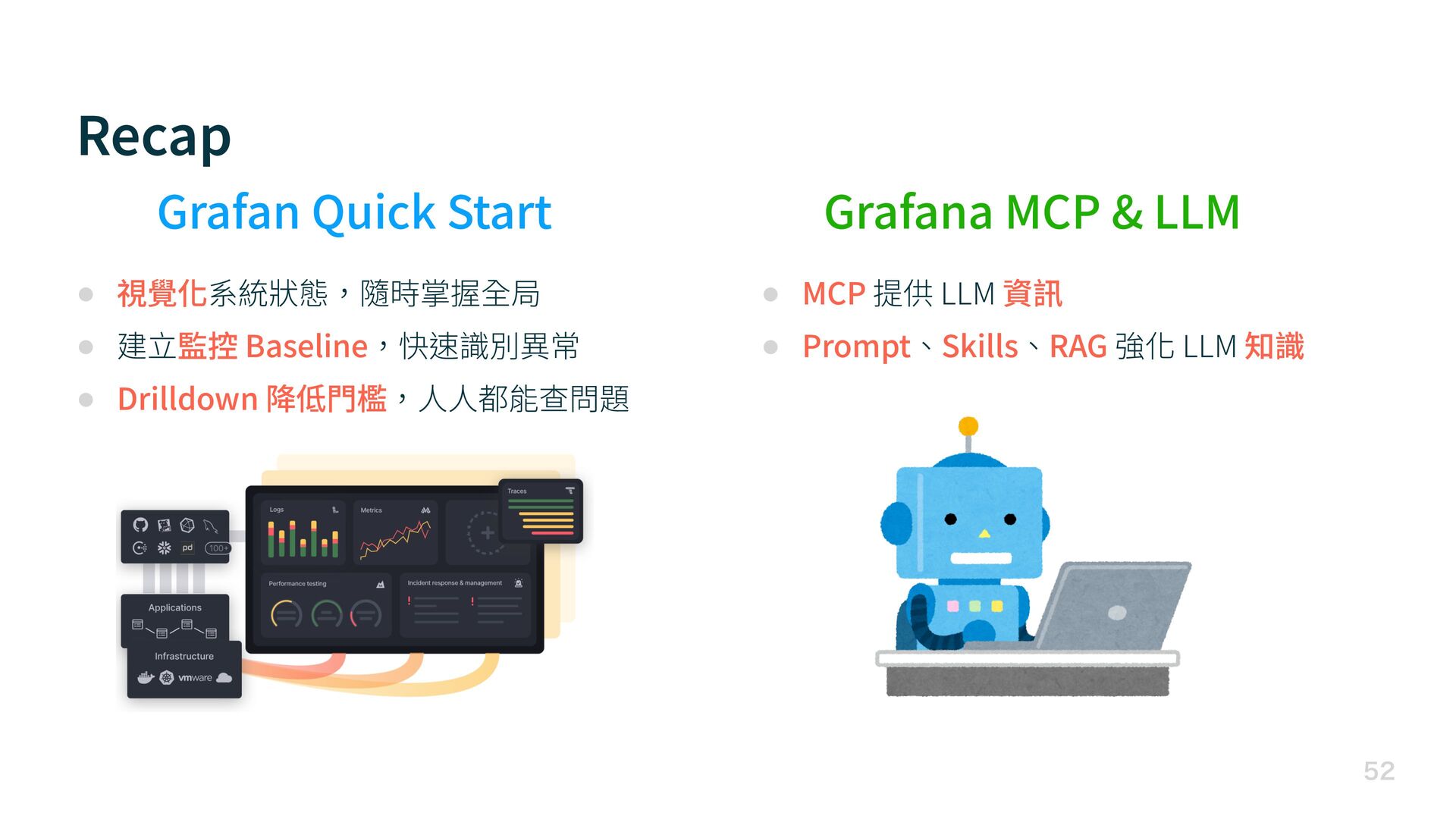 Drilldown 降低 門 檻, 人人 都能查問題 • MCP 提供 LLM 資訊 • Prompt、Skills、RAG 強化 LLM 知識 Grafan Quick Start Grafana MCP & LLM