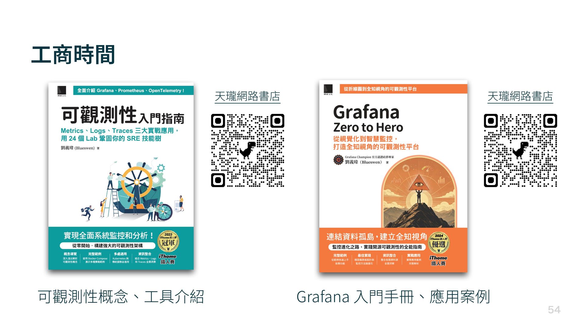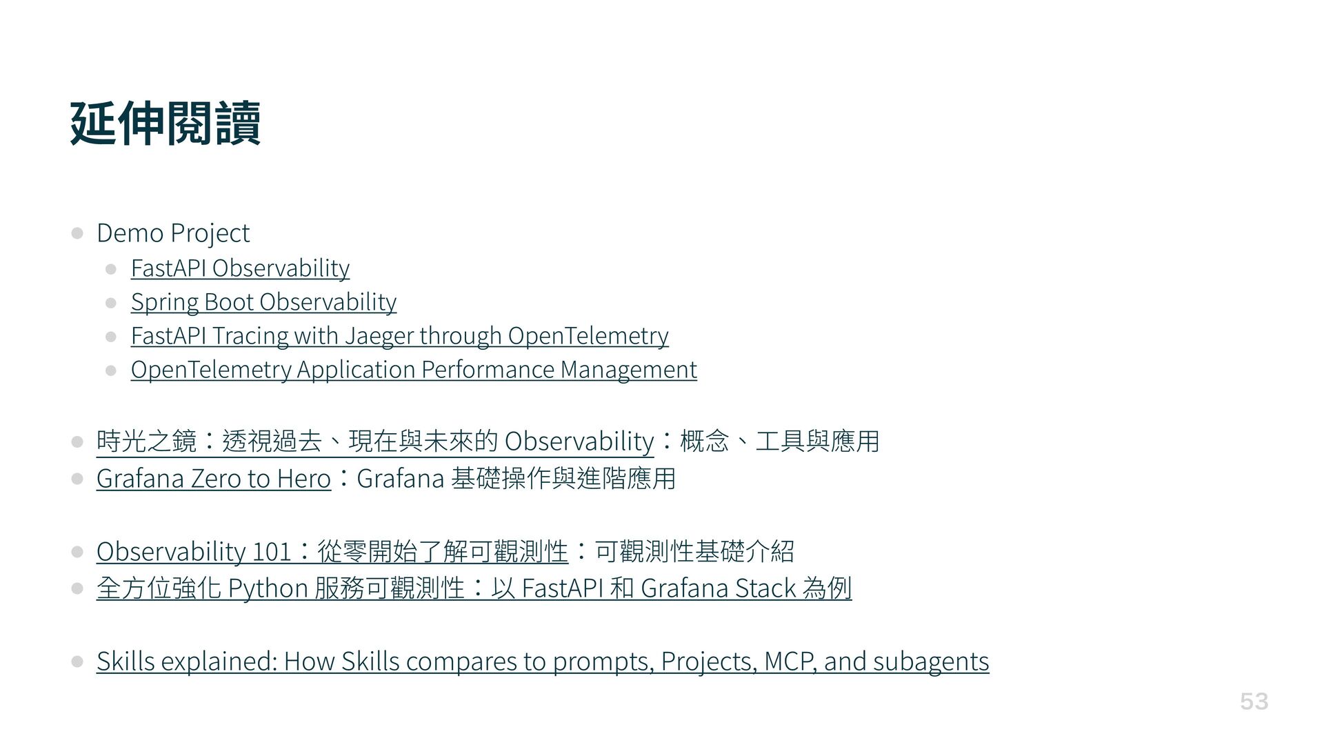 Boot Observability • FastAPI Tracing with Jaeger through OpenTelemetry • OpenTelemetry Application Performance Management • 時光之鏡:透視過去、現在與未來的 Observability:概念、 工 具與應 用 • Grafana Zero to Hero:Grafana 基礎操作與進階應 用 • Observability 1 0 1 :從零開始了解可觀測性:可觀測性基礎介紹 • 全 方 位強化 Python 服務可觀測性:以 FastAPI 和 Grafana Stack 為例 • Skills explained: How Skills compares to prompts, Projects, MCP, and subagents