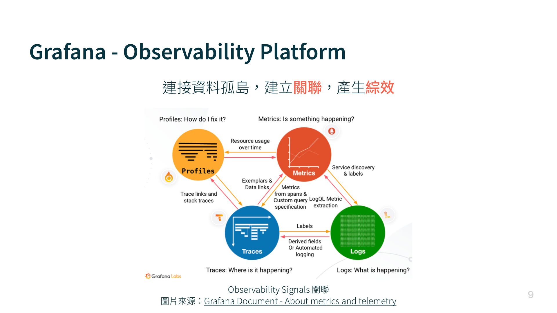 來源:Grafana Document - About metrics and telemetry 連接資料孤島,建 立 關聯,產 生 綜效
