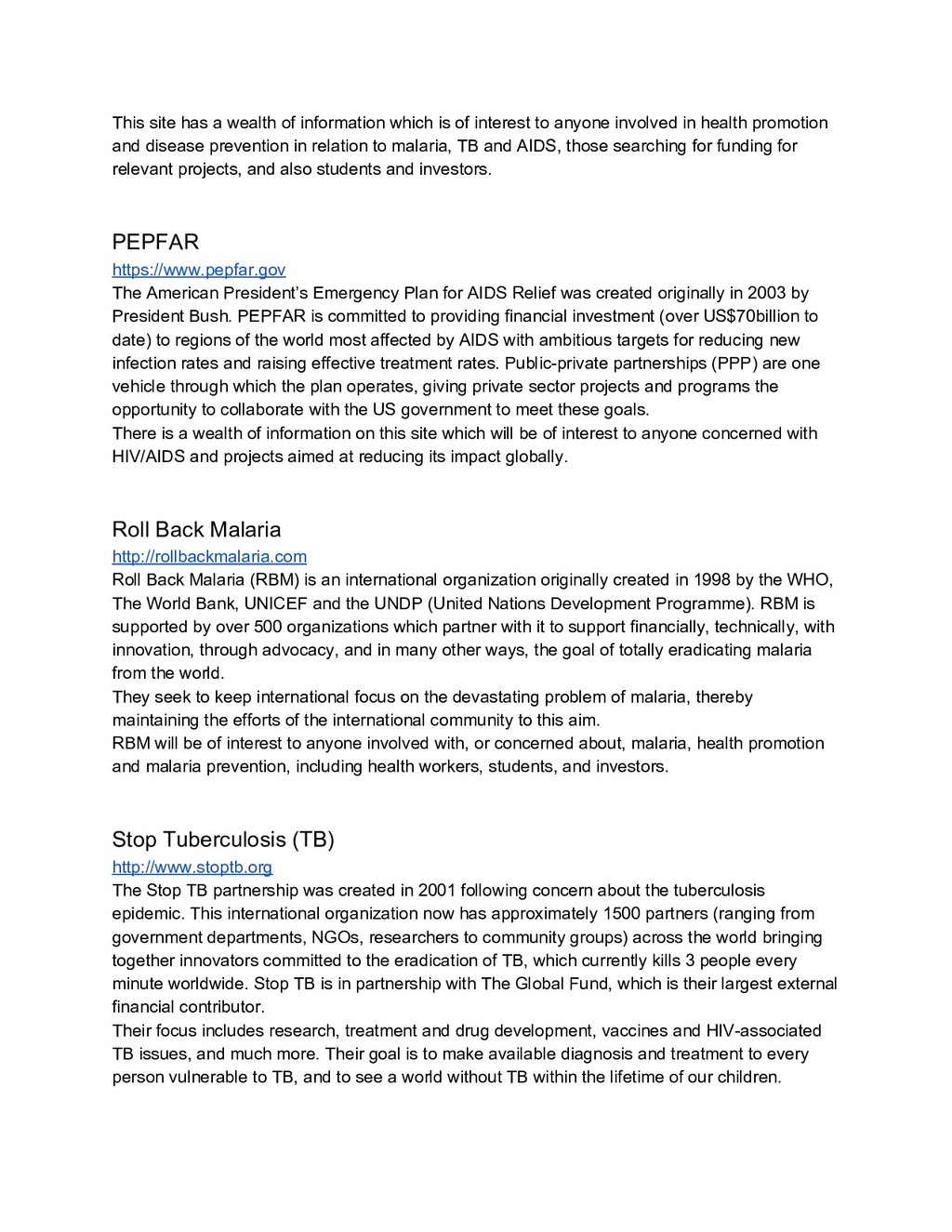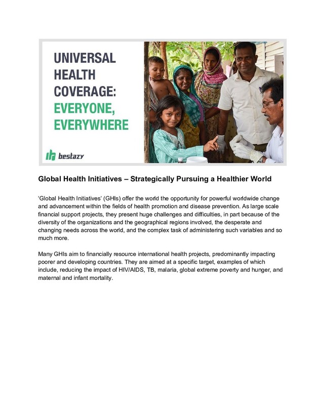 and through partnership, from the individual to organizations. This site provides a wealth of information regarding TB and the work to eradicate it, which is accessible for everyone interested in the work. The United Nations http://www.un.org/millenniumgoals/ http://www.un.org/sustainabledevelopment/ The United Nations, created in 1943, is an international organization which currently has 193 Member States. Its powerful charter provides it with the power to act in the interest of the world as a whole on a wide range of issues including, but not limited to, security, terrorism, climate change, poverty, health, humanitarian concerns, human rights, and food production. It promotes international governmental communication, negotiation, and offers hope for international agreement in a complex and diverse world. In 2000 the UN agreed the 8 Millennium Development Goals (MDGs), a vision for the world to aim towards by 2015. For the post-2015 era they have more recently agreed the Global Thematic Consultation on Health, with a vision for the year 2030. These goals provide a backbone, structure and focus for GHIs, and other large scale global operations. These websites provide clarity for understanding global policies, priorities and will be of interest to anyone concerned with global politics, policy making, health, poverty, climate change, human rights, and much more on the international arena. The World Bank http://projects.worldbank.org/P071233/multicountry-hivaids-program-africa-region?lang=en&tab =overview The World Bank states that its mission is to ‘end extreme poverty within a generation and boost shared prosperity’. The World Bank is not a conventional bank, but is an organization committed to helping developing countries reduce poverty through multiple financial services, technical help, training and advice. Services are broad, including low interest loans and credit to developing countries, and much more. They also provide free online education through their Online Learning Campus which serves 250,000 learners in 190 countries, and includes education on many topics ranging from agriculture, finance, ICT, macroeconomics and fiscal management. The World Bank will be of interest to a wide variety of people involved in national and international financial planning, management and government, as well as individuals worldwide, including students and investors. World Health Organization http://www.wpro.who.int/entity/country_focus/global_health_initiatives/en/