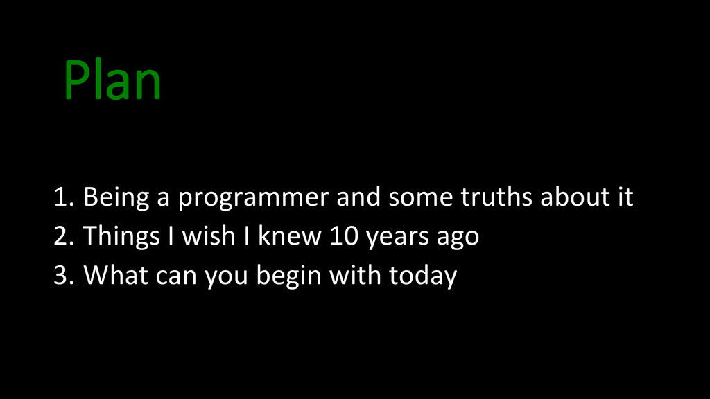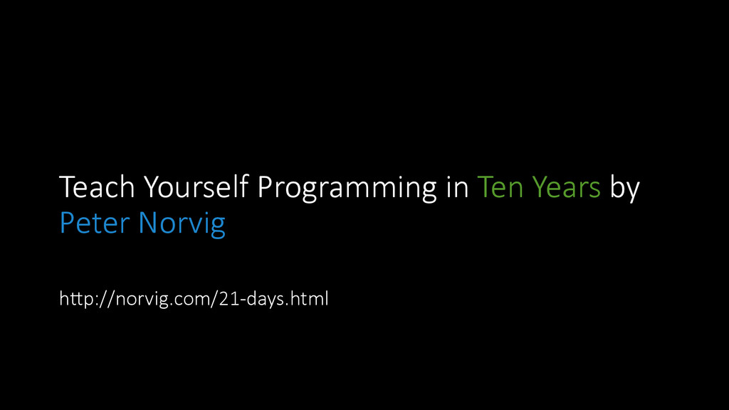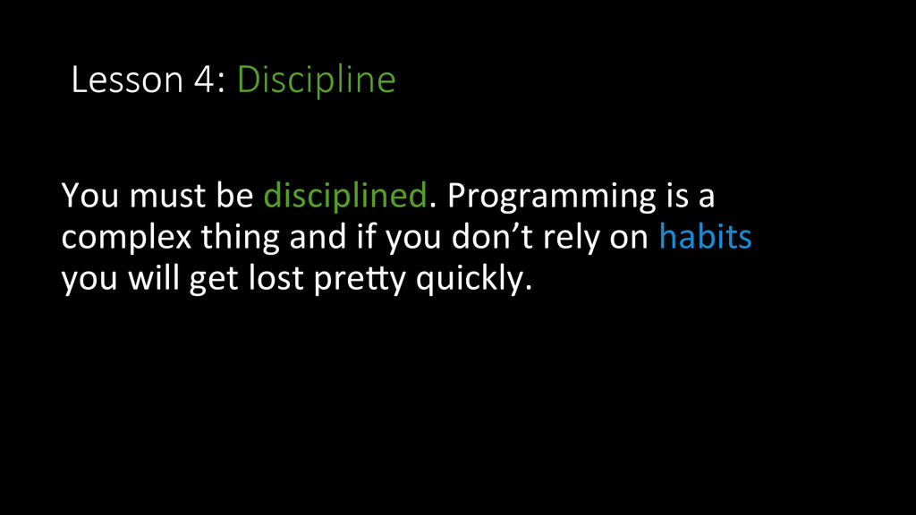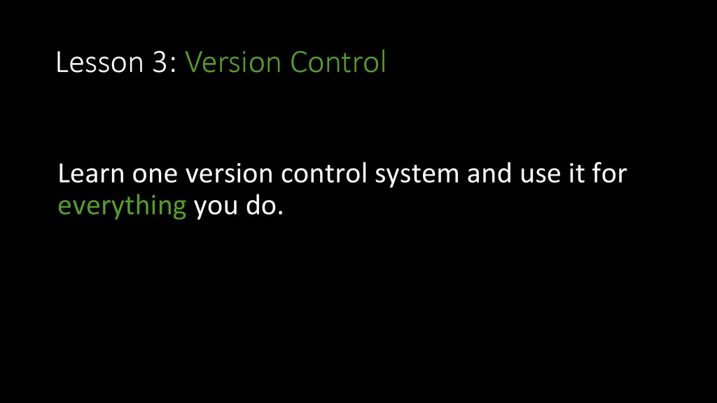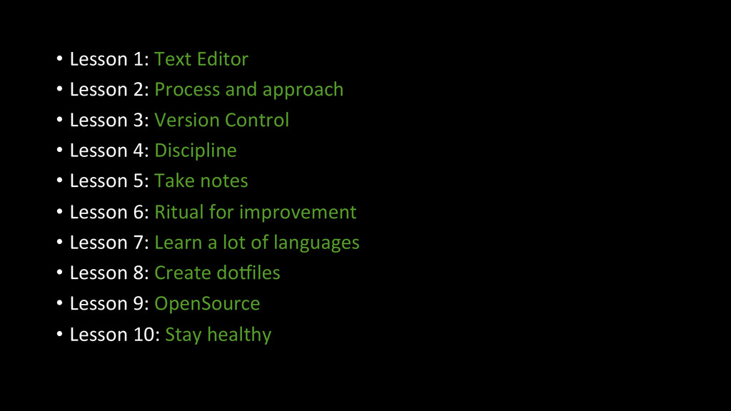 and approach • Lesson 3: Version Control • Lesson 4: Discipline • Lesson 5: Take notes • Lesson 6: Ritual for improvement • Lesson 7: Learn a lot of languages • Lesson 8: Create doniles • Lesson 9: OpenSource • Lesson 10: Stay healthy