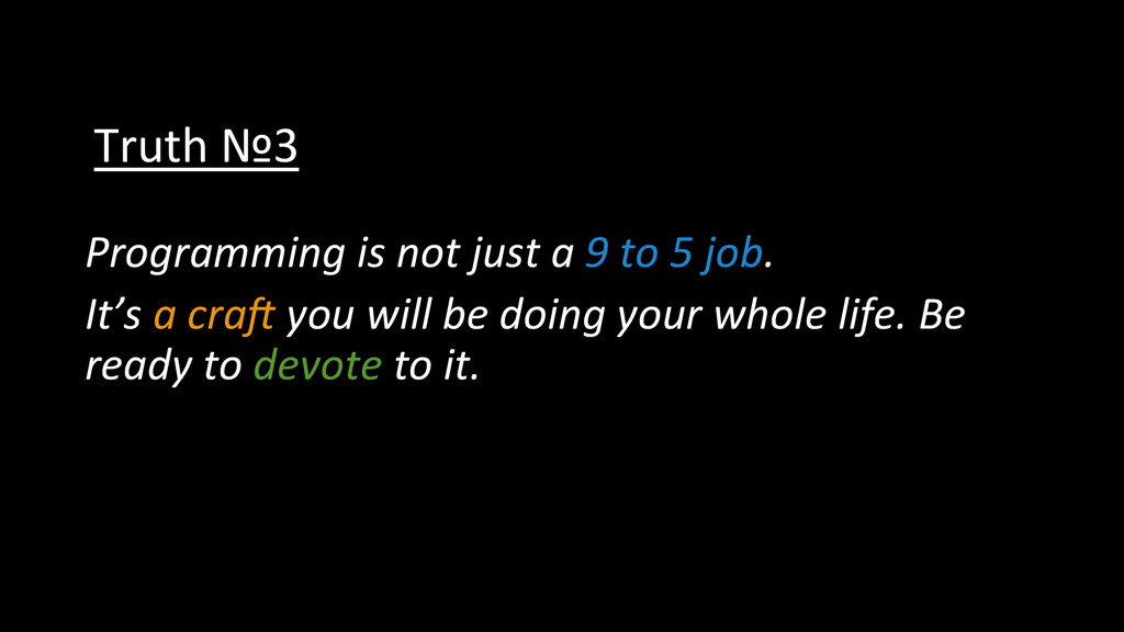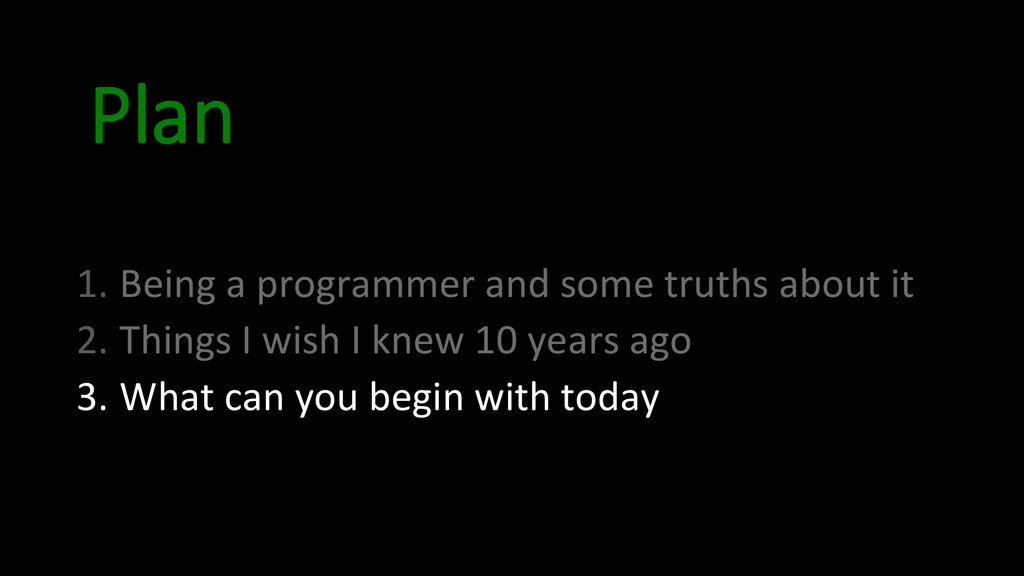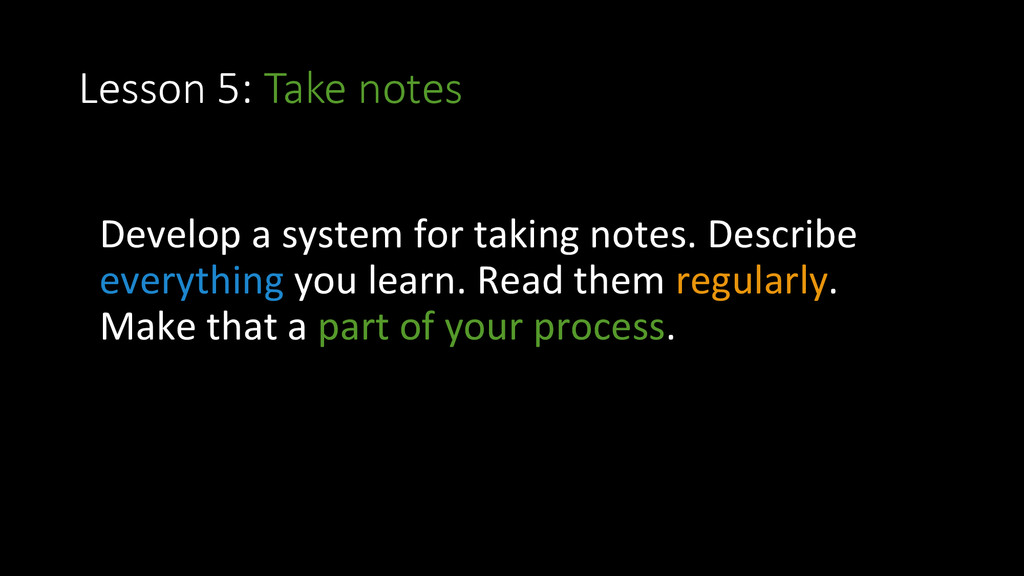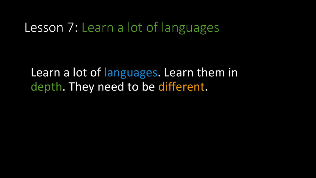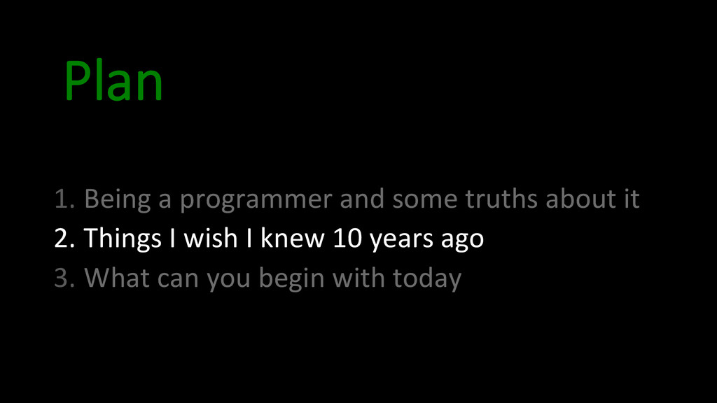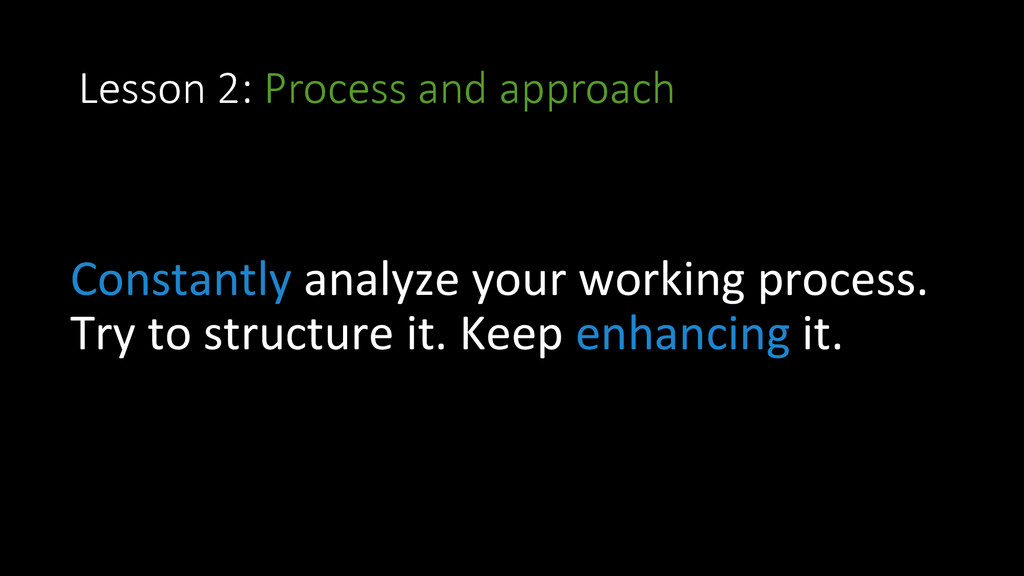and approach • Lesson 3: Version Control • Lesson 4: Discipline • Lesson 5: Take notes • Lesson 6: Ritual for improvement • Lesson 7: Learn a lot of languages • Lesson 8: Create doniles • Lesson 9: OpenSource • Lesson 10: Stay healthy
