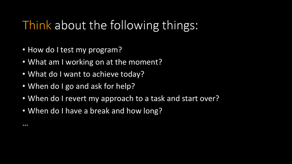 my program? • What am I working on at the moment? • What do I want to achieve today? • When do I go and ask for help? • When do I revert my approach to a task and start over? • When do I have a break and how long? …