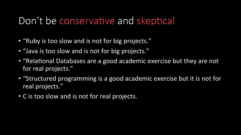 and is not for big projects.” • “Java is too slow and is not for big projects.” • “RelaWonal Databases are a good academic exercise but they are not for real projects.” • “Structured programming is a good academic exercise but it is not for real projects.” • C is too slow and is not for real projects.