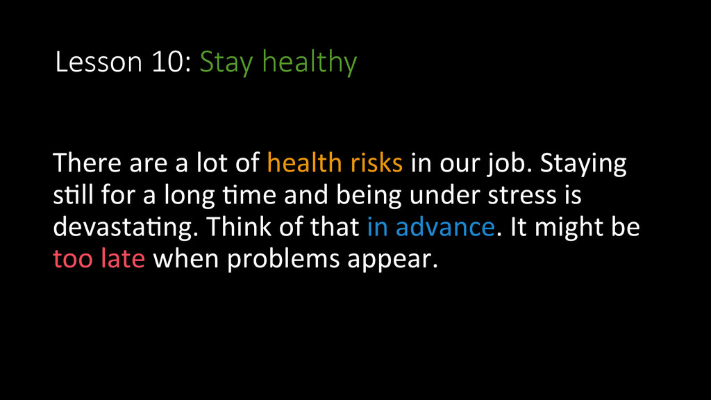risks in our job. Staying sWll for a long Wme and being under stress is devastaWng. Think of that in advance. It might be too late when problems appear.