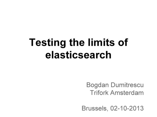 in one shard (~42 GB XML file) • Test done on development machine ◦ Intel 4 core machine ◦ 16 GB of RAM ◦ SSD for the OS (Windows 8 64b) ◦ HDD for elasticsearch • elasticsearch 0.90.5 ◦ 6GB of RAM allocated to the JVM