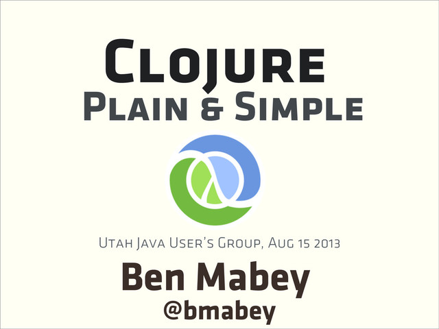 This introduction to Clojure was given to the Utah Java Users Group Aug. 15. It's main focus was on Clojure's time model and how the design of Clojure separates (decomplects) many concepts which are all implemented on top of Objects in Java, and other OO languages. This is the abstract for the original talk: