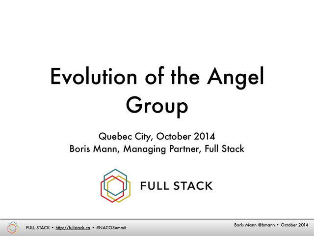 angel investment firm, founded January 2013 • Full Stack invests in early-stage web tech companies • Based in Vancouver, BC • 9 investments during our Prototype (to July 2014), typical check size of $150K - $250K • Lance Tracey & Boris Mann Boris Mann @bmann • October 2014