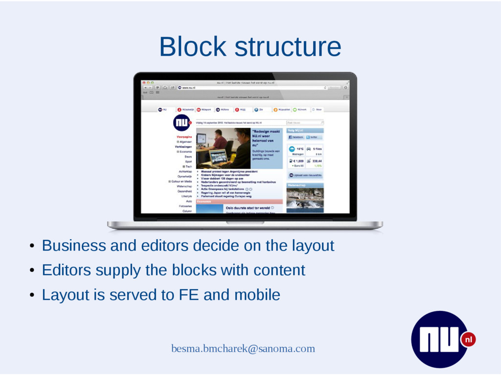 layout • Editors supply the blocks with content • Layout is served to FE and mobile