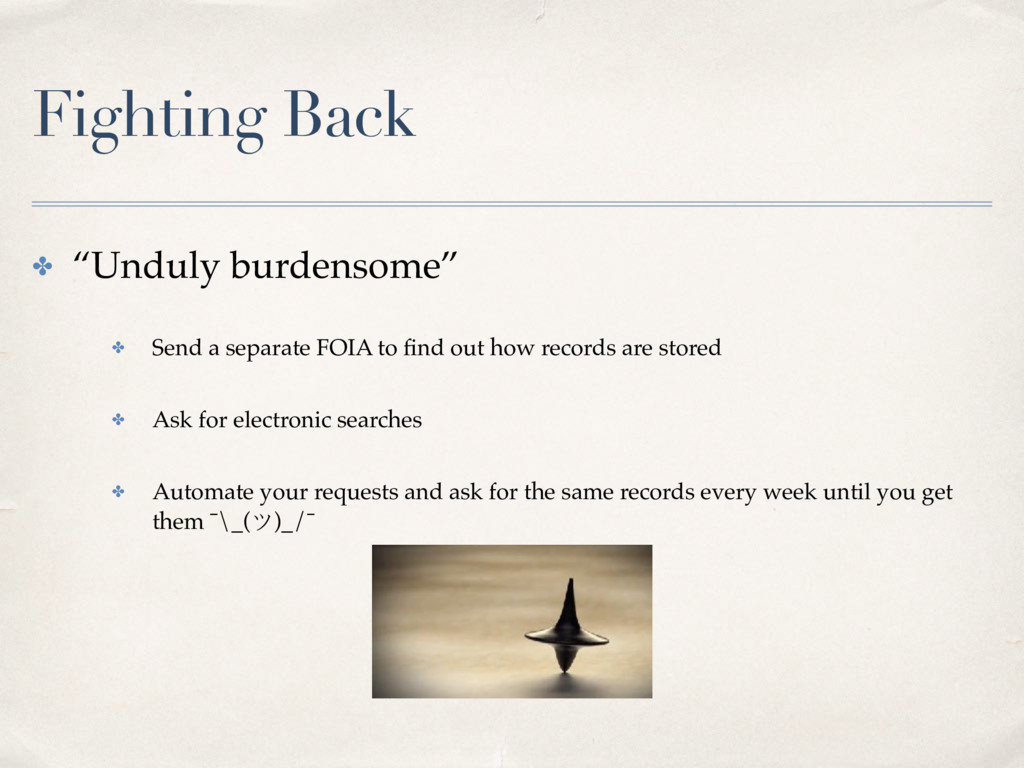 to find out how records are stored ✤ Ask for electronic searches ✤ Automate your requests and ask for the same records every week until you get them ¯\_(ツ)_/¯