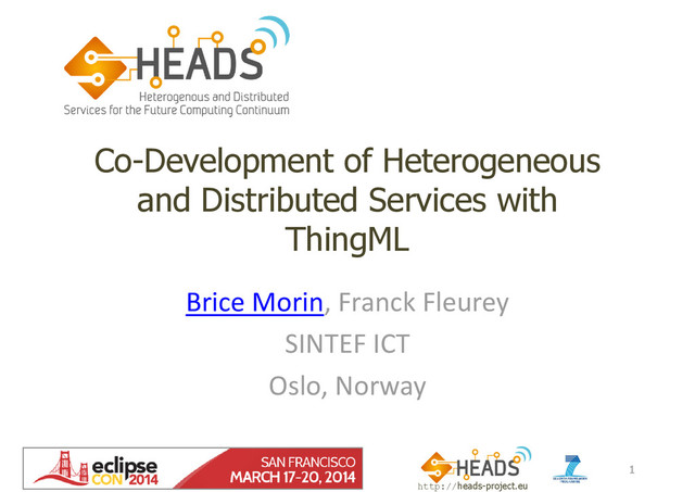 modeling language for IoT/M2M Rely on Eclipse technologies Compile to C/C++ (down to 2KB RAM!), JVM, etc Open‐source Enables the co‐development of HD‐services • Future Work Dynamic management of HD‐Services, by wrapping ThingML component into Kevoree Provide higher‐level concepts in ThingML e.g. CEP Target lighter JVMs (Java8 SE/ME instead of Scala) To be done within the HEADS project 10