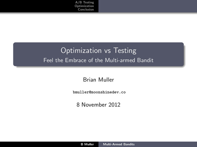 Example Method: Epsilon-decreasing Epsilon-decreasing example. # conversions = { # :firstchoice => 0.5, # :secondchoice => 0.4, # ... # } # starttime = Time.now.to_i def pull_arm(conversions, starttime) # 1 for first minute, then decreasing from there epsilon = [ 60.0 / (Time.now.to_i - starttime), 1 ].min if rand > epsilon conversions.max_by { |k, v| v }.first else conversions.keys.sample end end B Muller Multi-Armed Bandits