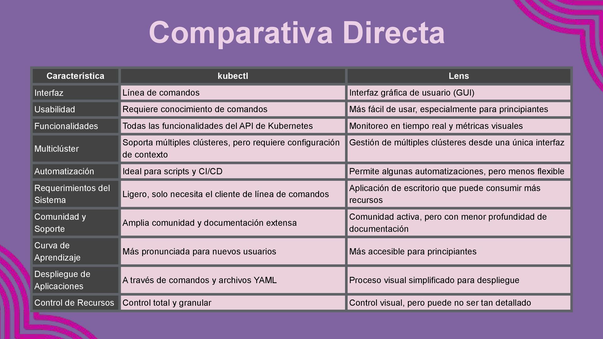 gráfica de usuario (GUI) Usabilidad Requiere conocimiento de comandos Más fácil de usar, especialmente para principiantes Funcionalidades Todas las funcionalidades del API de Kubernetes Monitoreo en tiempo real y métricas visuales Multiclúster Soporta múltiples clústeres, pero requiere configuración de contexto Gestión de múltiples clústeres desde una única interfaz Automatización Ideal para scripts y CI/CD Permite algunas automatizaciones, pero menos flexible Requerimientos del Sistema Ligero, solo necesita el cliente de línea de comandos Aplicación de escritorio que puede consumir más recursos Comunidad y Soporte Amplia comunidad y documentación extensa Comunidad activa, pero con menor profundidad de documentación Curva de Aprendizaje Más pronunciada para nuevos usuarios Más accesible para principiantes Despliegue de Aplicaciones A través de comandos y archivos YAML Proceso visual simplificado para despliegue Control de Recursos Control total y granular Control visual, pero puede no ser tan detallado