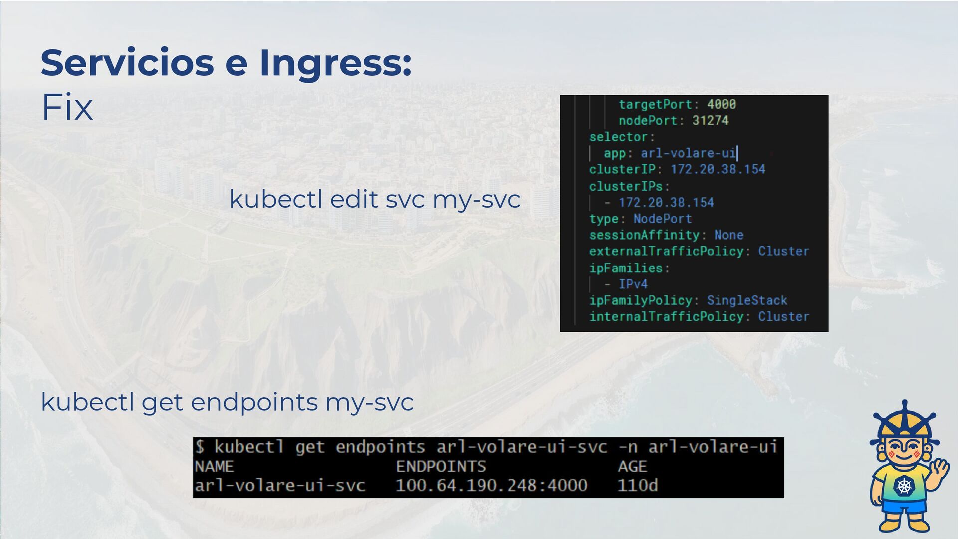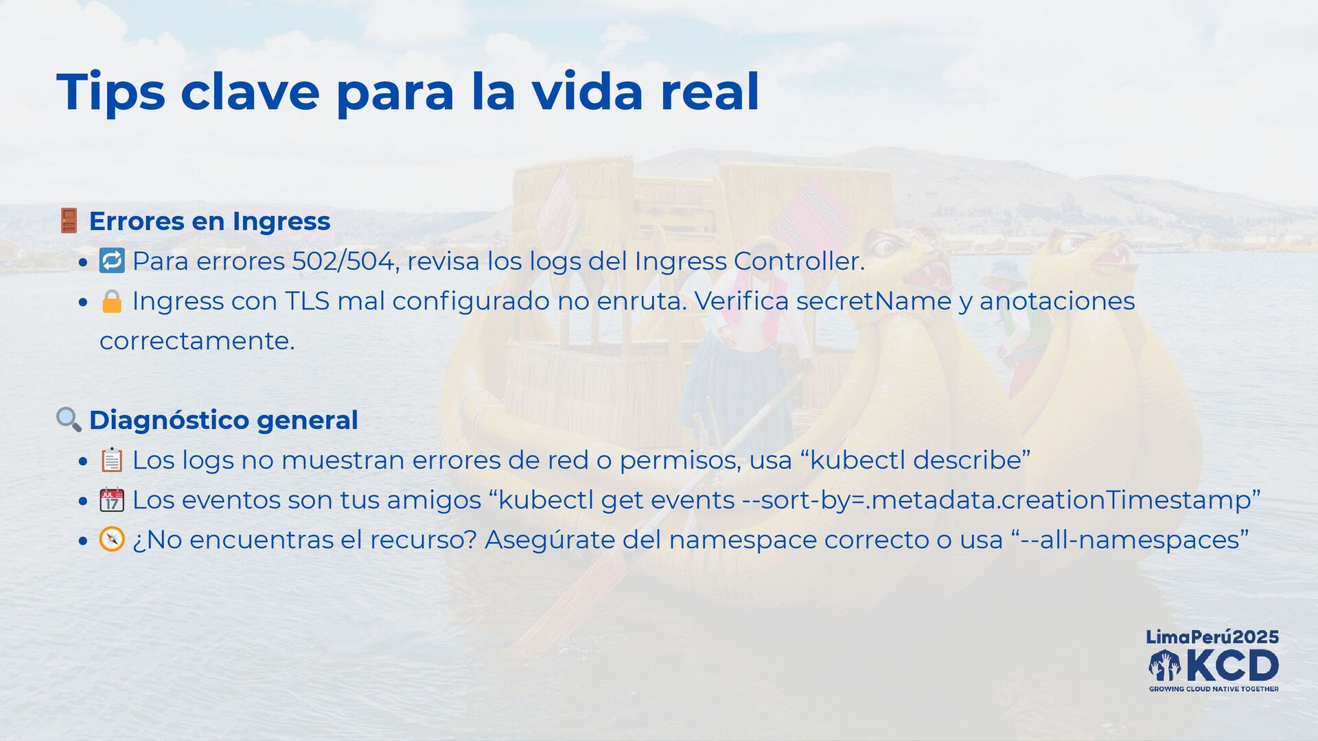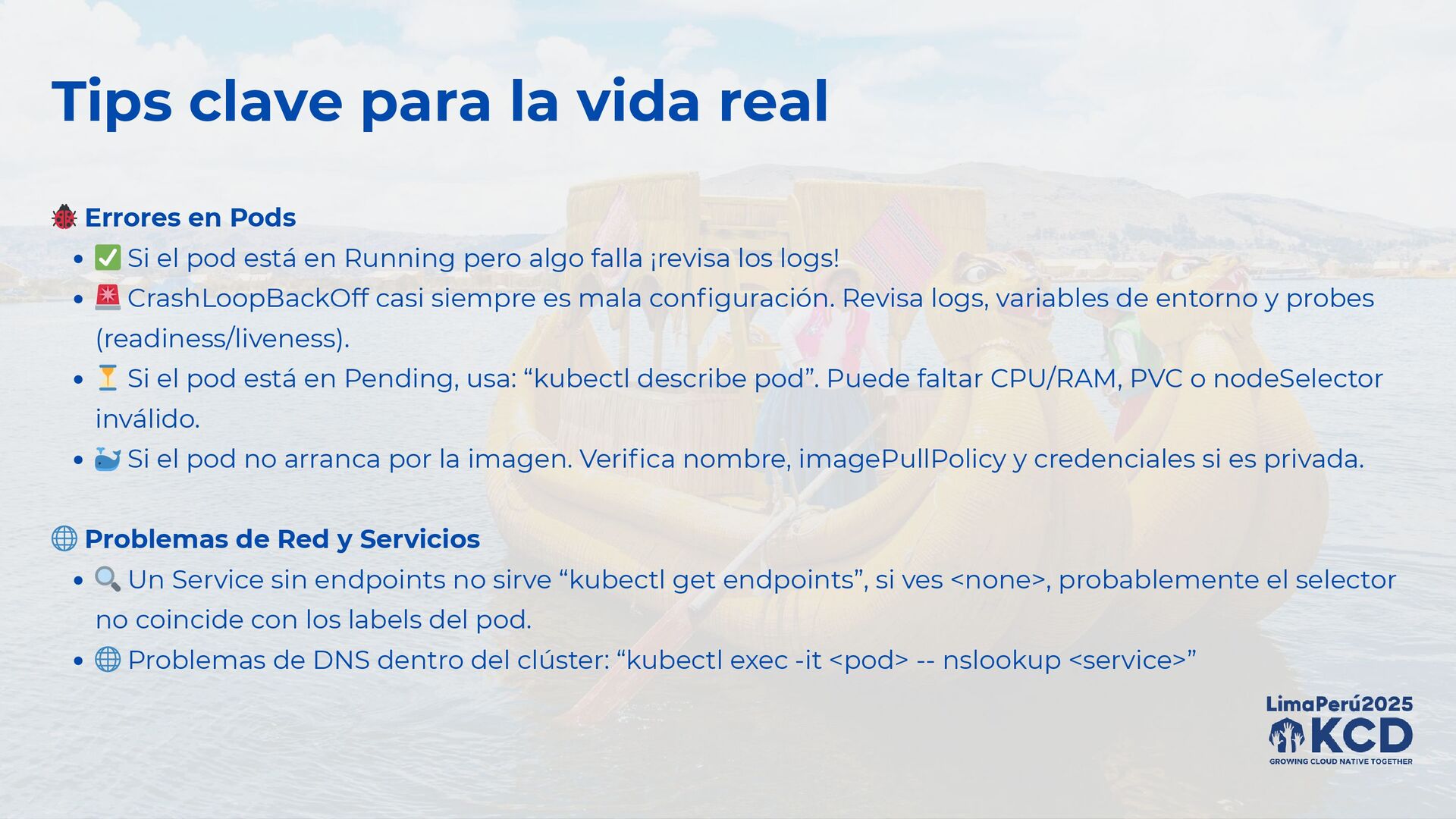 ✅ Si el pod está en Running pero algo falla ¡revisa los logs! 🚨 CrashLoopBackOff casi siempre es mala configuración. Revisa logs, variables de entorno y probes (readiness/liveness). ⏳ Si el pod está en Pending, usa: “kubectl describe pod”. Puede faltar CPU/RAM, PVC o nodeSelector inválido. 🐳 Si el pod no arranca por la imagen. Verifica nombre, imagePullPolicy y credenciales si es privada. 🌐 Problemas de Red y Servicios 🔍 Un Service sin endpoints no sirve “kubectl get endpoints”, si ves <none>, probablemente el selector no coincide con los labels del pod. 🌐 Problemas de DNS dentro del clúster: “kubectl exec -it <pod> -- nslookup <service>”