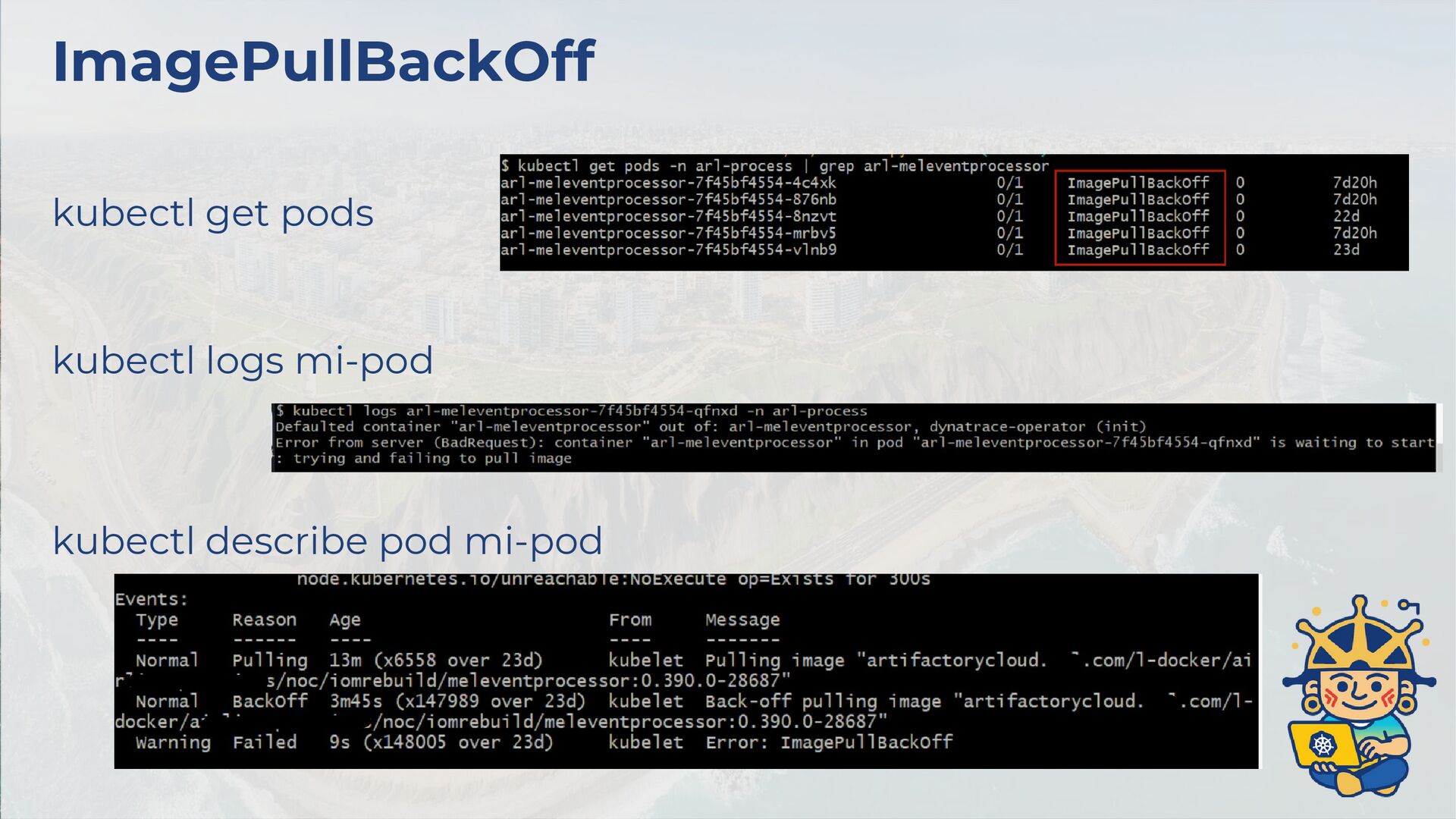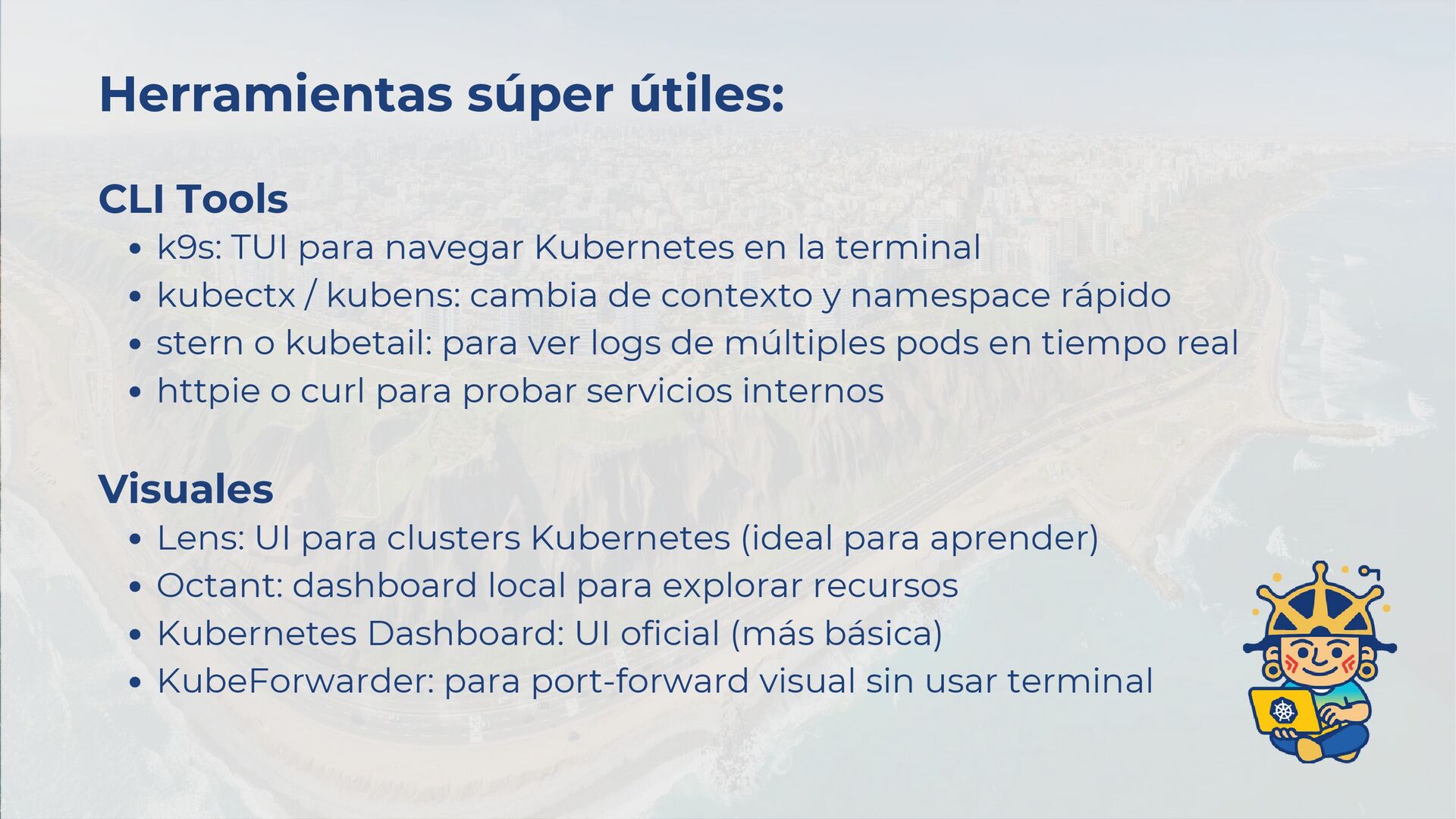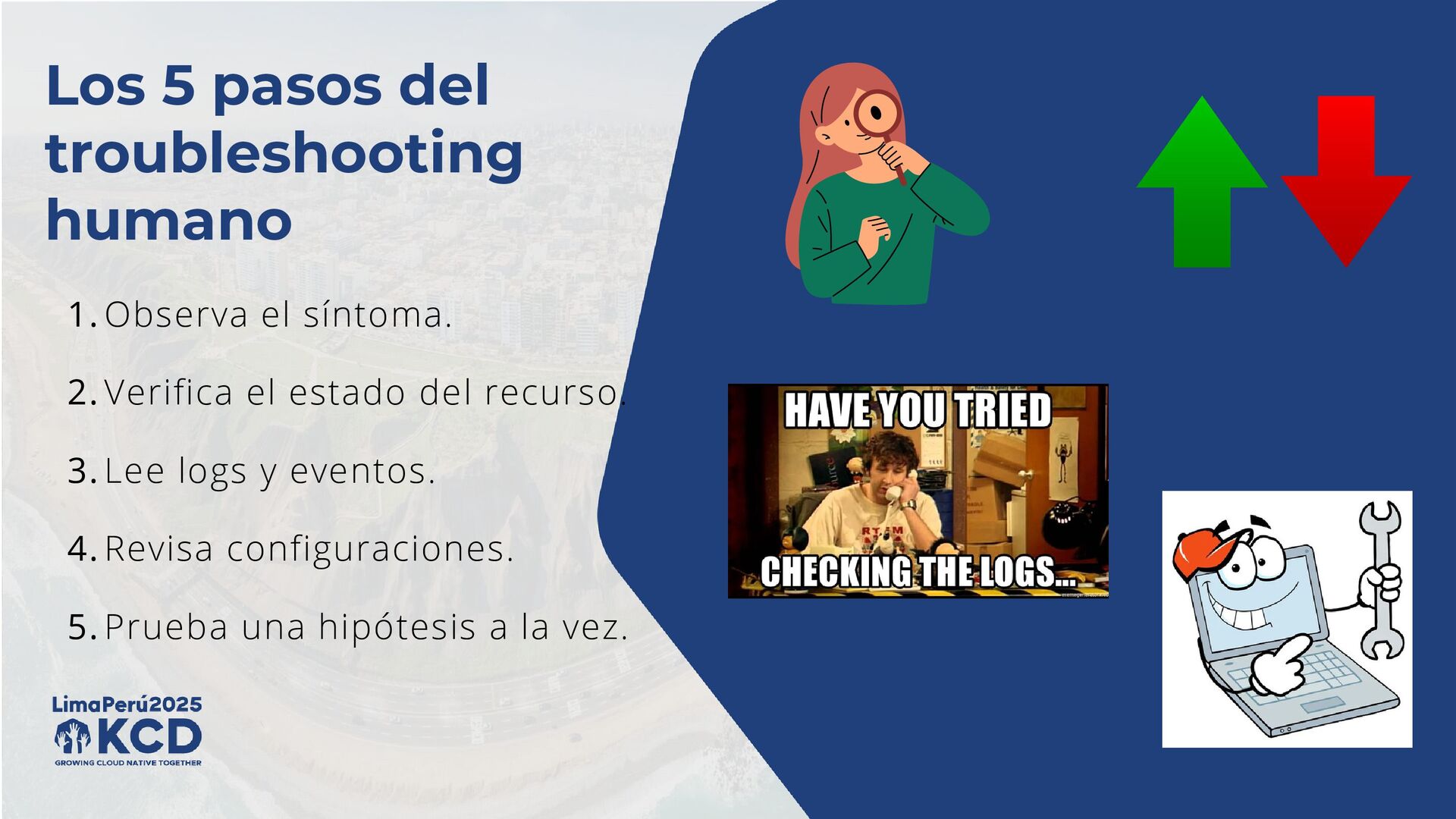 ✅ Si el pod está en Running pero algo falla ¡revisa los logs! 🚨 CrashLoopBackOff casi siempre es mala configuración. Revisa logs, variables de entorno y probes (readiness/liveness). ⏳ Si el pod está en Pending, usa: “kubectl describe pod”. Puede faltar CPU/RAM, PVC o nodeSelector inválido. 🐳 Si el pod no arranca por la imagen. Verifica nombre, imagePullPolicy y credenciales si es privada. 🌐 Problemas de Red y Servicios 🔍 Un Service sin endpoints no sirve “kubectl get endpoints”, si ves <none>, probablemente el selector no coincide con los labels del pod. 🌐 Problemas de DNS dentro del clúster: “kubectl exec -it <pod> -- nslookup <service>”