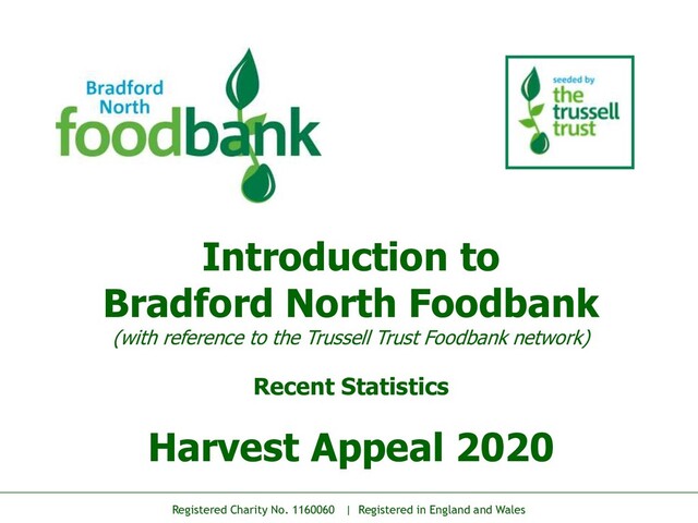 north- east Bradford • Part of a national foodbank network run by the Trussell Trust: “Feeding local people in crisis” • A member of ‘Feeding Bradford’ a local partnership tackling food poverty in Bradford Bradford North Foodbank is: