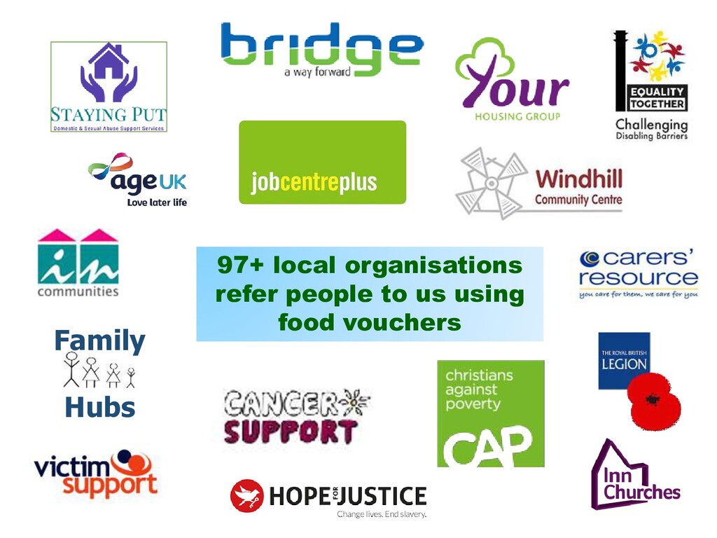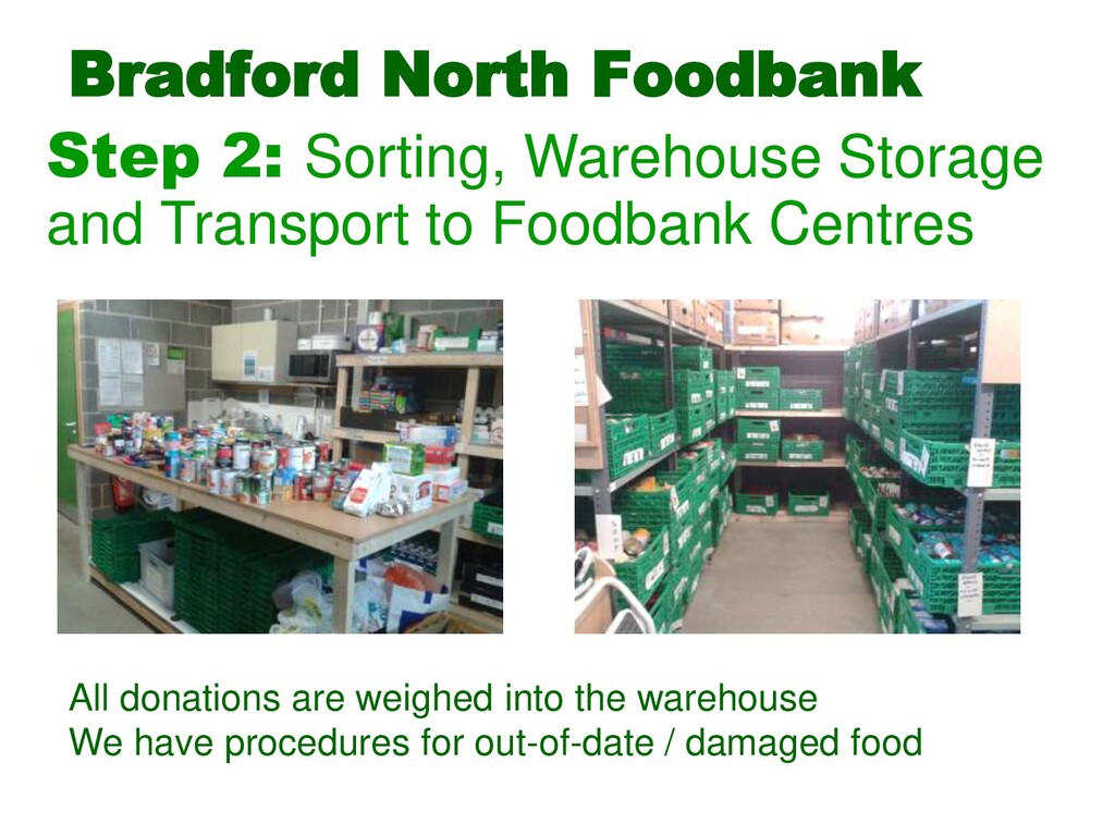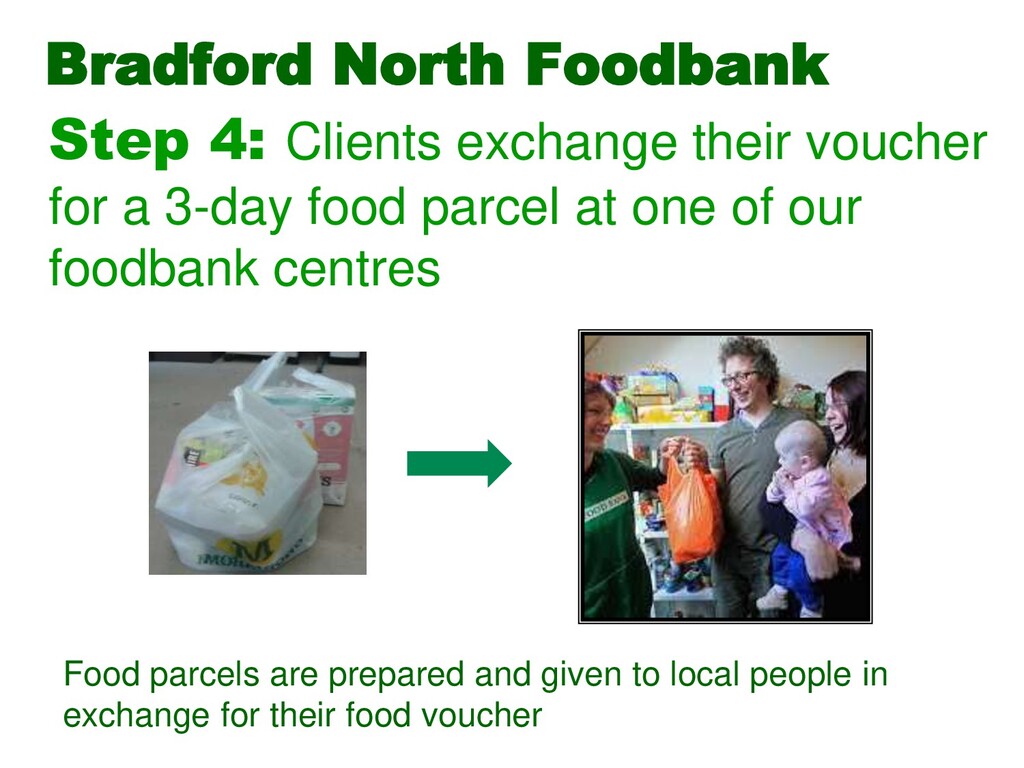 Support Workers • Church Pastoral Staff • School Pastoral Staff Bradford North Foodbank Step 3: Local Care Professionals Give Food Vouchers To Local People In Crisis Referral agencies need to register with us before they can start issuing food vouchers