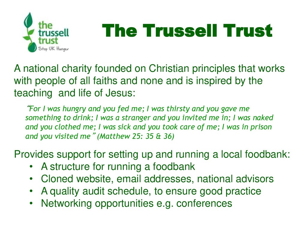 people of all faiths and none and is inspired by the teaching and life of Jesus: Provides support for setting up and running a local foodbank: • A structure for running a foodbank • Cloned website, email addresses, national advisors • A quality audit schedule, to ensure good practice • Networking opportunities e.g. conferences “For I was hungry and you fed me; I was thirsty and you gave me something to drink; I was a stranger and you invited me in; I was naked and you clothed me; I was sick and you took care of me; I was in prison and you visited me” (Matthew 25: 35 & 36) The Trussell Trust
