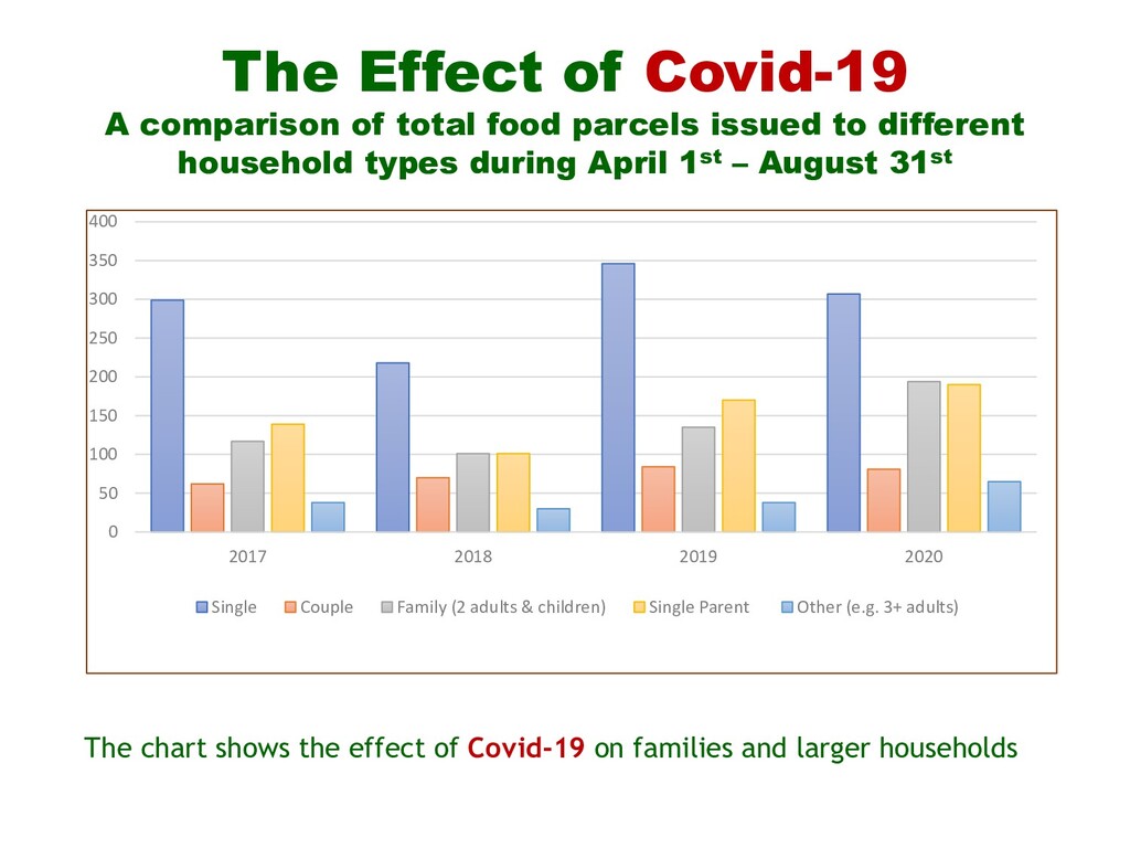 issued to different household types during April 1st – August 31st 0 50 100 150 200 250 300 350 400 2017 2018 2019 2020 Single Couple Family (2 adults & children) Single Parent Other (e.g. 3+ adults) The chart shows the effect of Covid-19 on families and larger households