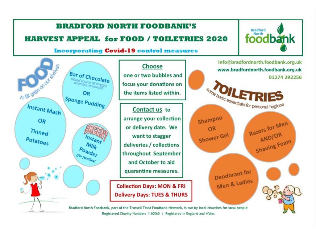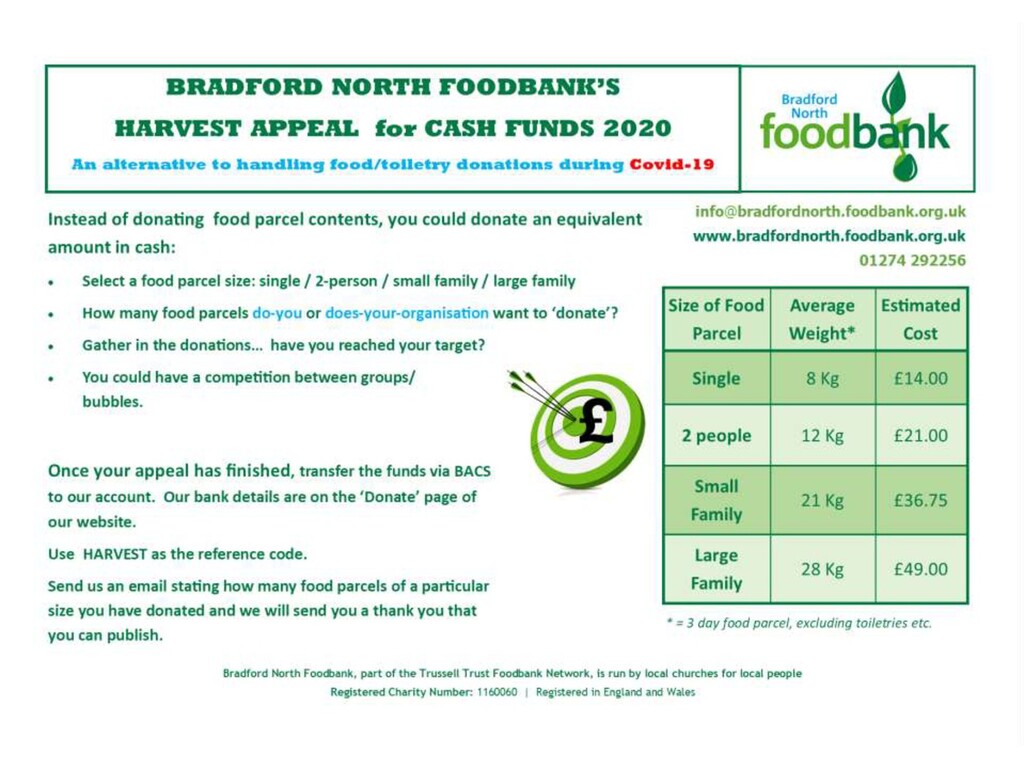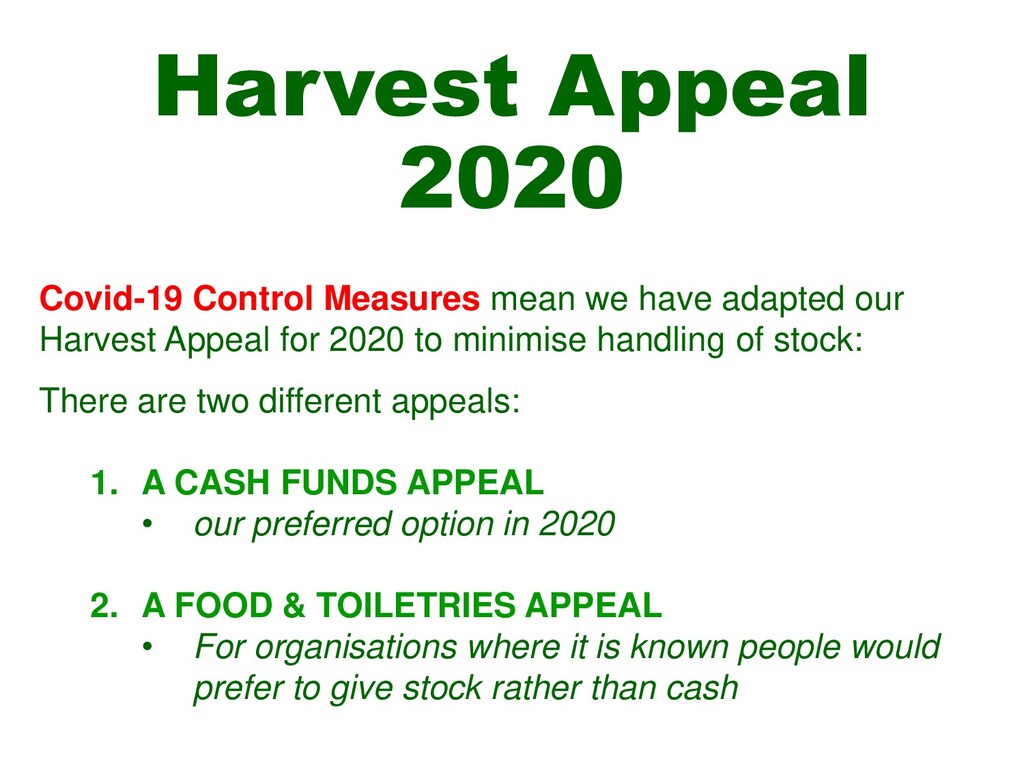 our Harvest Appeal for 2020 to minimise handling of stock: There are two different appeals: 1. A CASH FUNDS APPEAL • our preferred option in 2020 2. A FOOD & TOILETRIES APPEAL • For organisations where it is known people would prefer to give stock rather than cash
