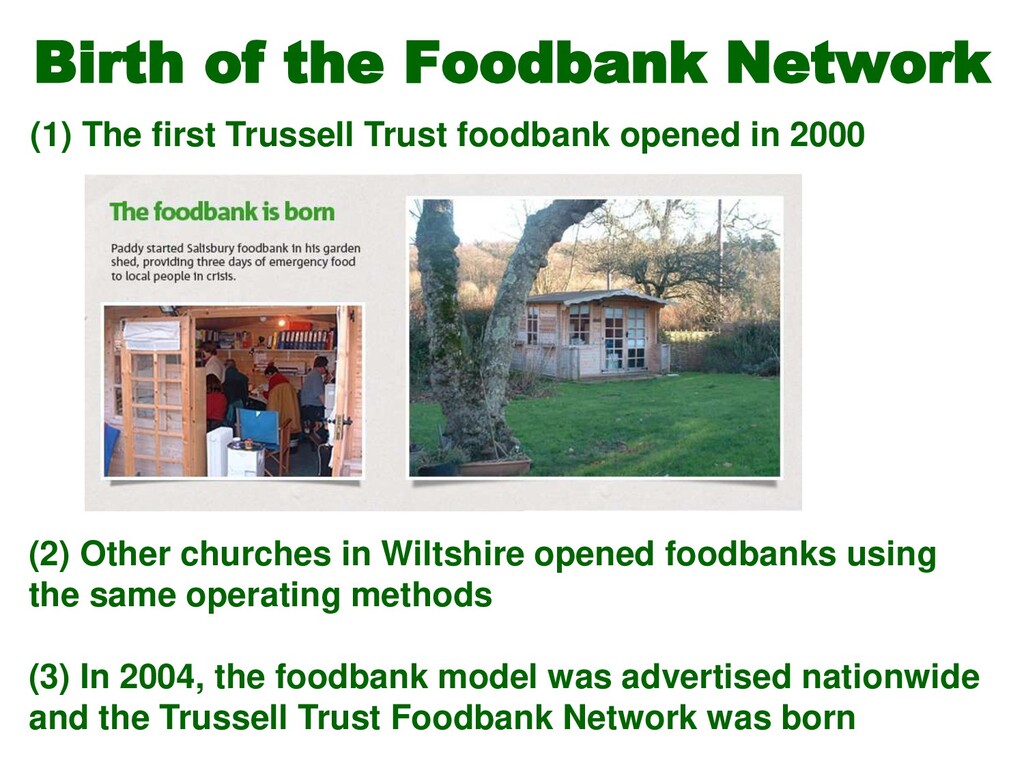 of the Foodbank Network (2) Other churches in Wiltshire opened foodbanks using the same operating methods (3) In 2004, the foodbank model was advertised nationwide and the Trussell Trust Foodbank Network was born