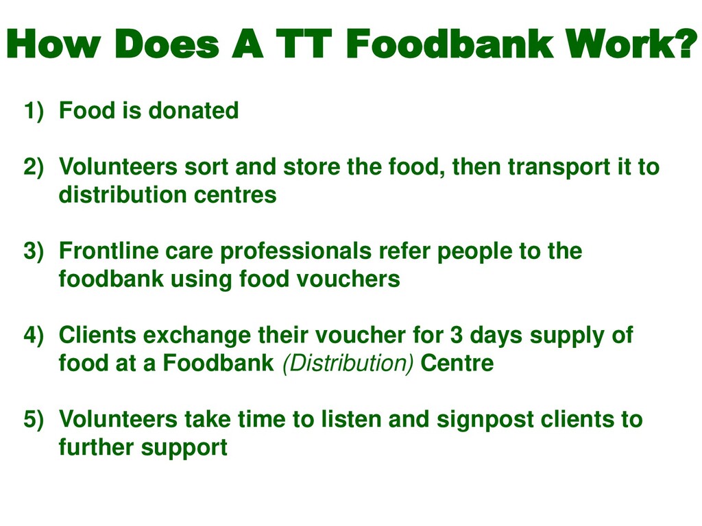 2) Volunteers sort and store the food, then transport it to distribution centres 3) Frontline care professionals refer people to the foodbank using food vouchers 4) Clients exchange their voucher for 3 days supply of food at a Foodbank (Distribution) Centre 5) Volunteers take time to listen and signpost clients to further support
