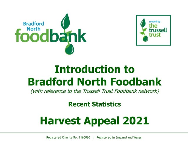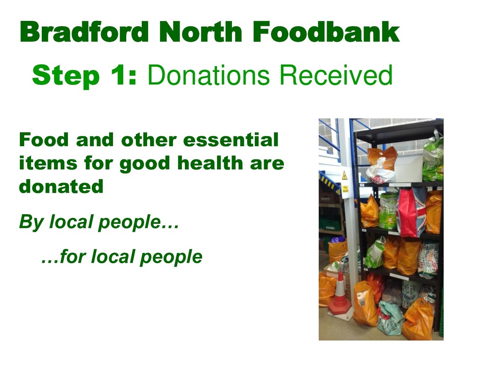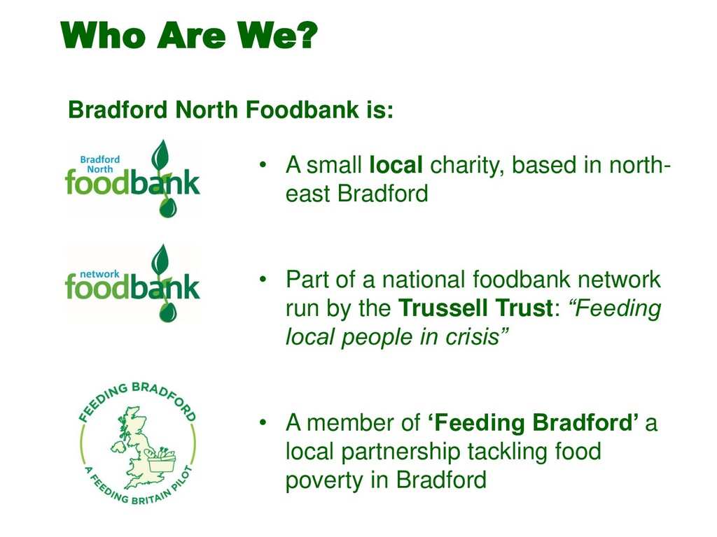 north- east Bradford • Part of a national foodbank network run by the Trussell Trust: “Feeding local people in crisis” • A member of ‘Feeding Bradford’ a local partnership tackling food poverty in Bradford Bradford North Foodbank is: