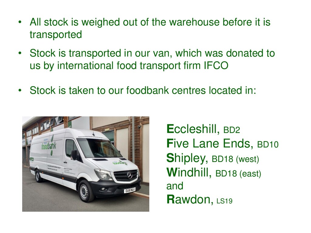 BD18 (east) and Rawdon, LS19 • All stock is weighed out of the warehouse before it is transported • Stock is transported in our van, which was donated to us by international food transport firm IFCO • Stock is taken to our foodbank centres located in: