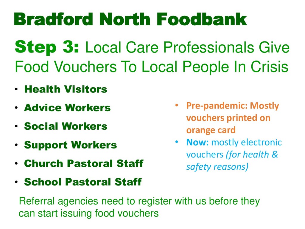 Support Workers • Church Pastoral Staff • School Pastoral Staff Bradford North Foodbank Step 3: Local Care Professionals Give Food Vouchers To Local People In Crisis Referral agencies need to register with us before they can start issuing food vouchers • Pre-pandemic: Mostly vouchers printed on orange card • Now: mostly electronic vouchers (for health & safety reasons)
