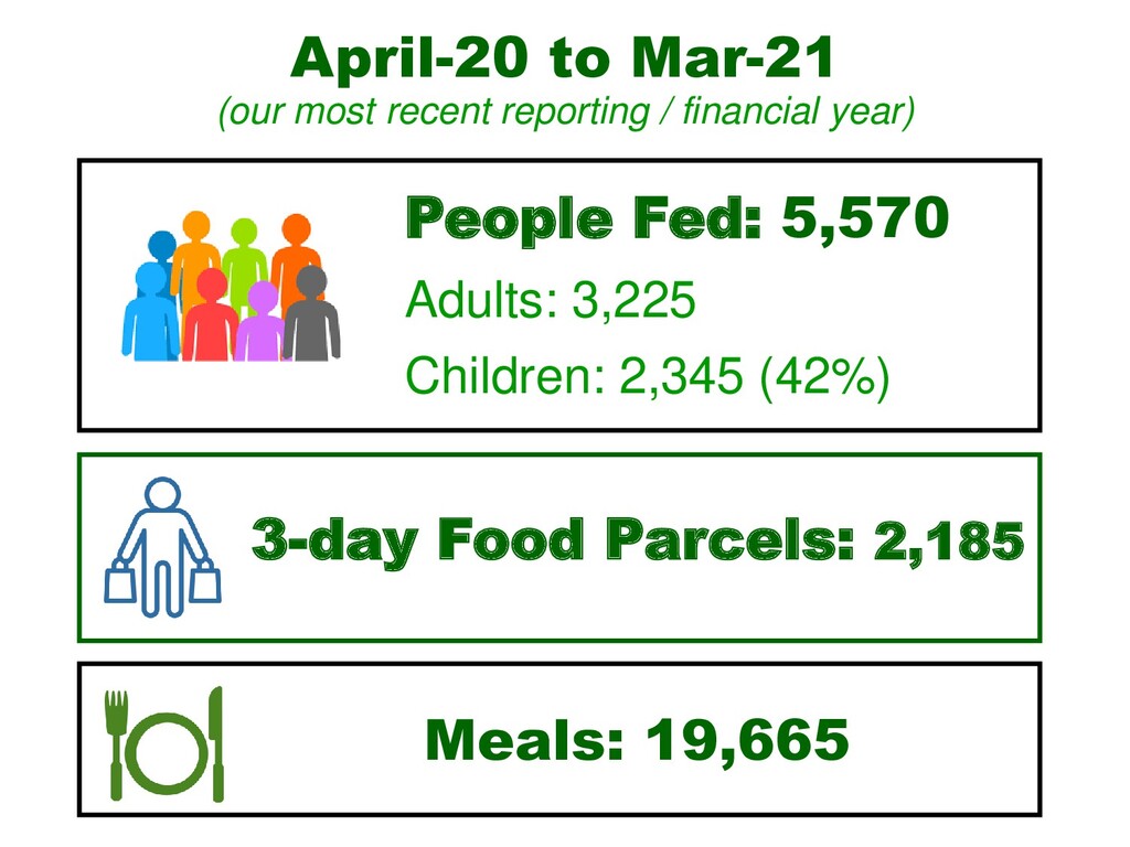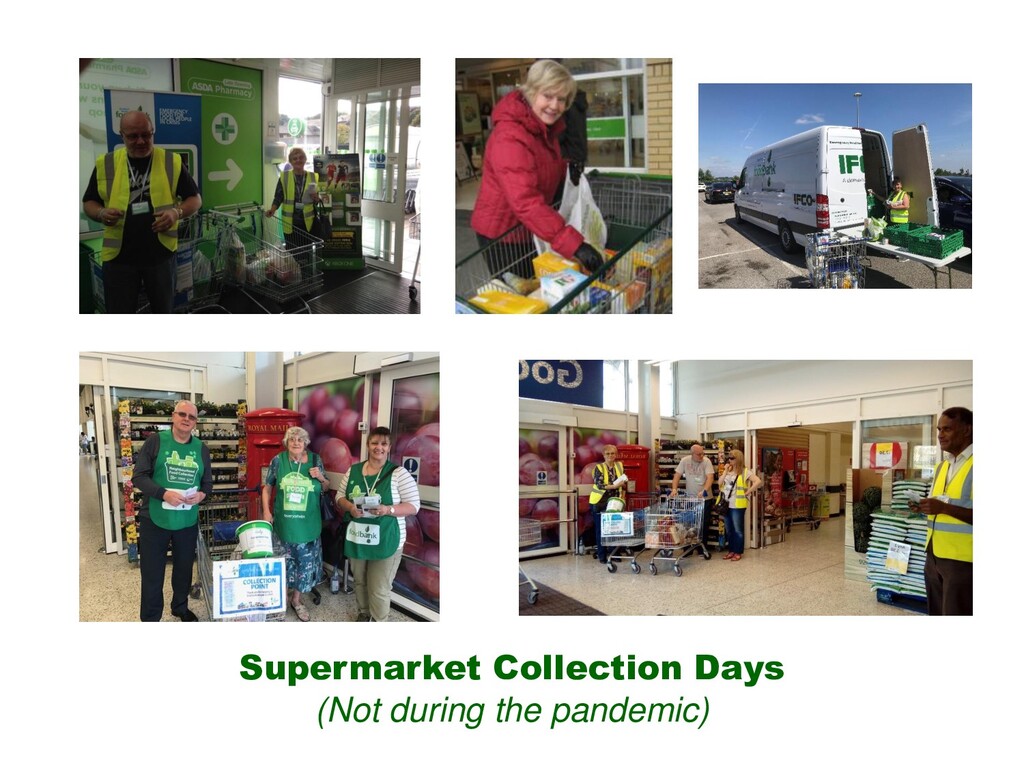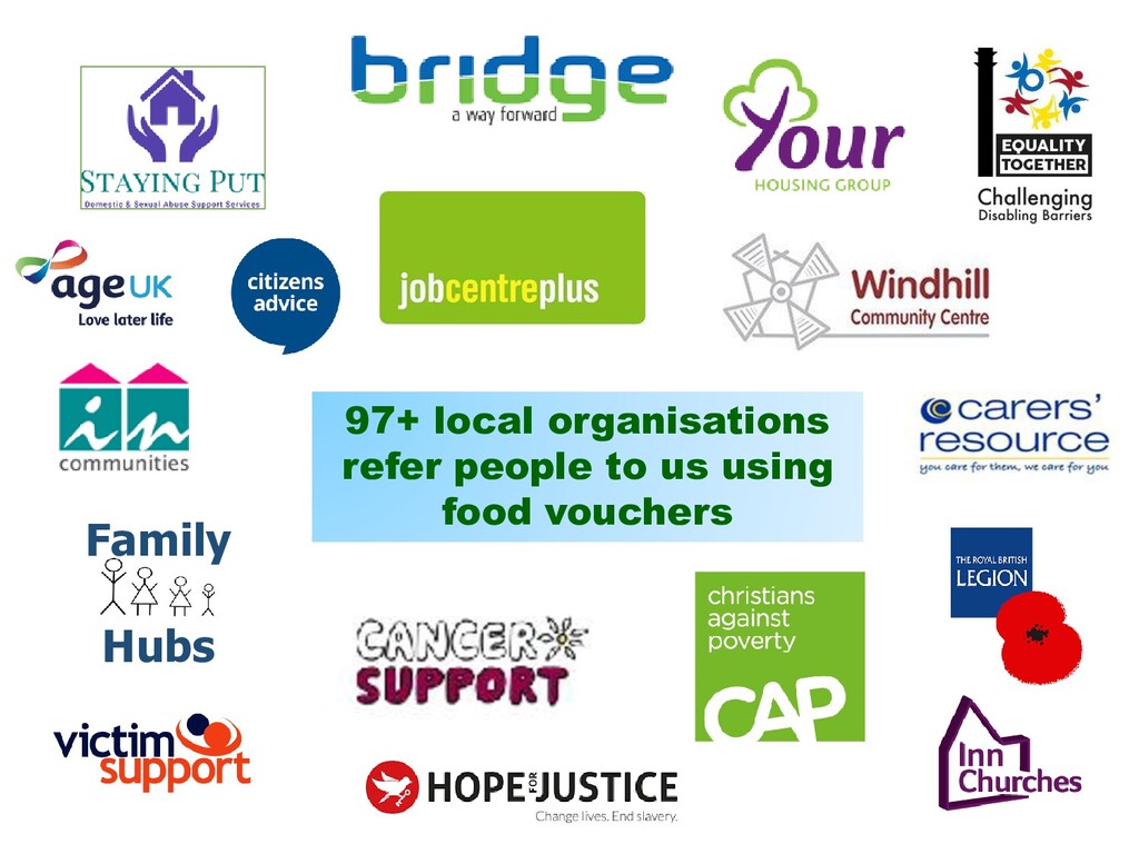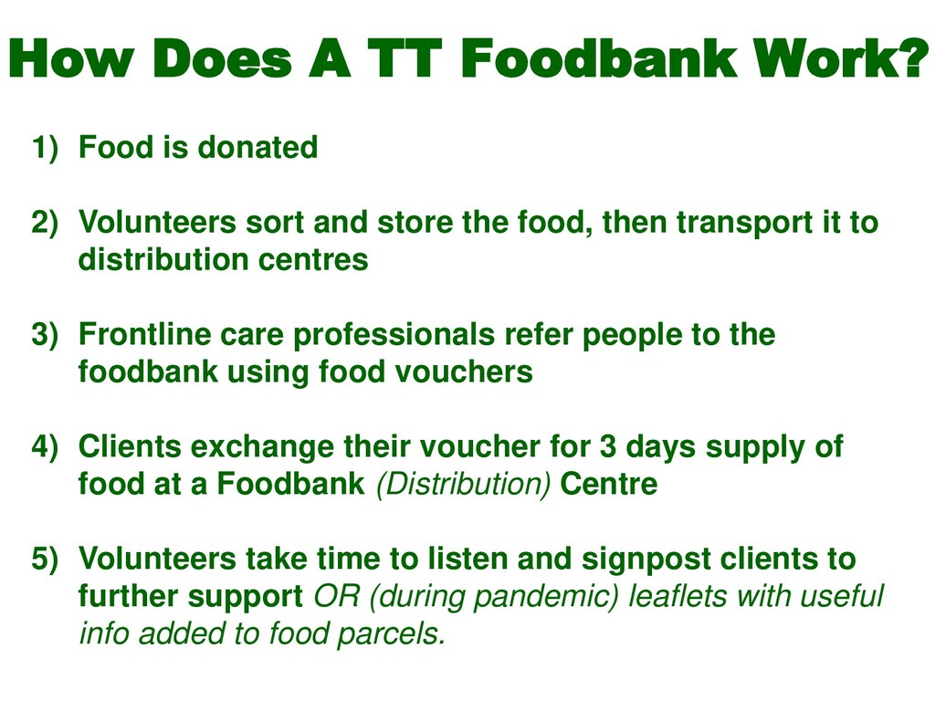 2) Volunteers sort and store the food, then transport it to distribution centres 3) Frontline care professionals refer people to the foodbank using food vouchers 4) Clients exchange their voucher for 3 days supply of food at a Foodbank (Distribution) Centre 5) Volunteers take time to listen and signpost clients to further support OR (during pandemic) leaflets with useful info added to food parcels.