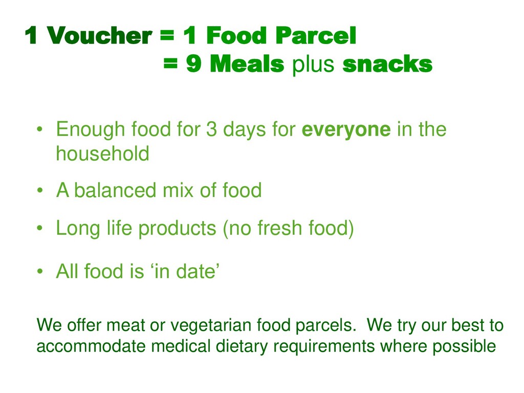 household • A balanced mix of food • Long life products (no fresh food) • All food is ‘in date’ 1 Voucher = 1 Food Parcel = 9 Meals plus snacks We offer meat or vegetarian food parcels. We try our best to accommodate medical dietary requirements where possible