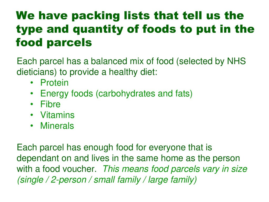 quantity of foods to put in the food parcels Each parcel has a balanced mix of food (selected by NHS dieticians) to provide a healthy diet: • Protein • Energy foods (carbohydrates and fats) • Fibre • Vitamins • Minerals Each parcel has enough food for everyone that is dependant on and lives in the same home as the person with a food voucher. This means food parcels vary in size (single / 2-person / small family / large family)
