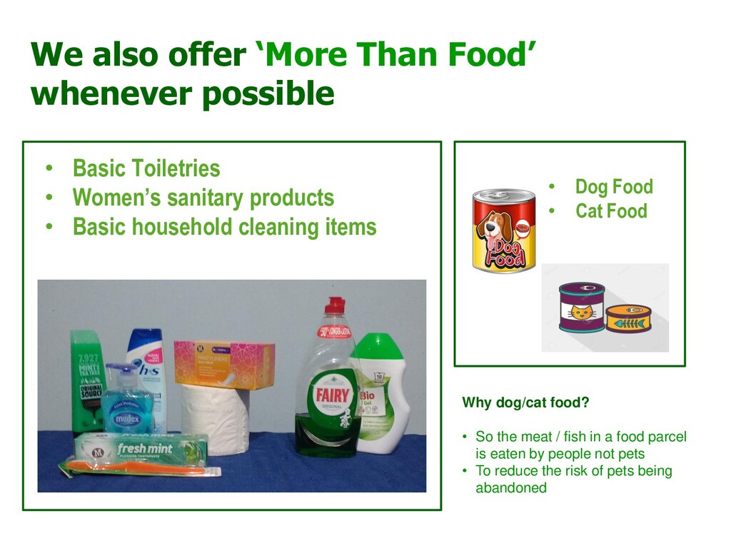 Toiletries • Women’s sanitary products • Basic household cleaning items • Dog Food • Cat Food Why dog/cat food? • So the meat / fish in a food parcel is eaten by people not pets • To reduce the risk of pets being abandoned