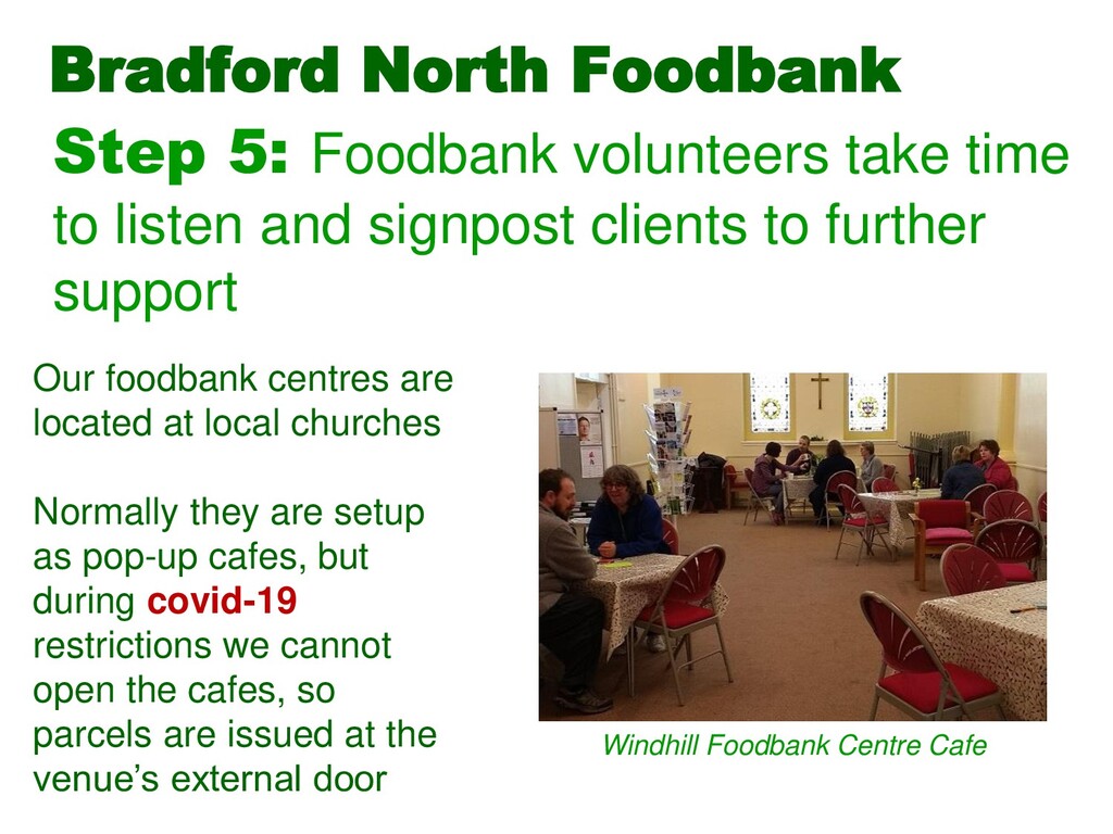 listen and signpost clients to further support Our foodbank centres are located at local churches Normally they are setup as pop-up cafes, but during covid-19 restrictions we cannot open the cafes, so parcels are issued at the venue’s external door Windhill Foodbank Centre Cafe
