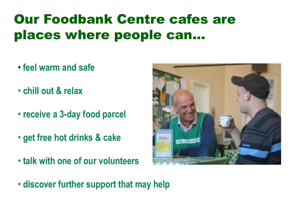 • receive a 3-day food parcel • get free hot drinks & cake • talk with one of our volunteers • discover further support that may help Our Foodbank Centre cafes are places where people can…