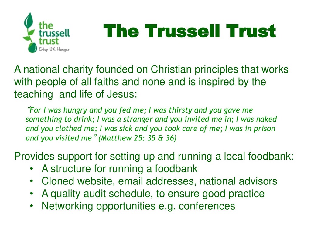 people of all faiths and none and is inspired by the teaching and life of Jesus: Provides support for setting up and running a local foodbank: • A structure for running a foodbank • Cloned website, email addresses, national advisors • A quality audit schedule, to ensure good practice • Networking opportunities e.g. conferences “For I was hungry and you fed me; I was thirsty and you gave me something to drink; I was a stranger and you invited me in; I was naked and you clothed me; I was sick and you took care of me; I was in prison and you visited me” (Matthew 25: 35 & 36) The Trussell Trust