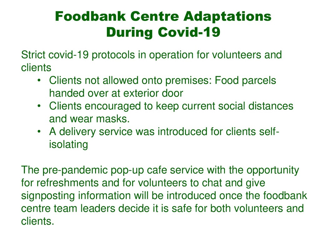 for volunteers and clients • Clients not allowed onto premises: Food parcels handed over at exterior door • Clients encouraged to keep current social distances and wear masks. • A delivery service was introduced for clients self- isolating The pre-pandemic pop-up cafe service with the opportunity for refreshments and for volunteers to chat and give signposting information will be introduced once the foodbank centre team leaders decide it is safe for both volunteers and clients.