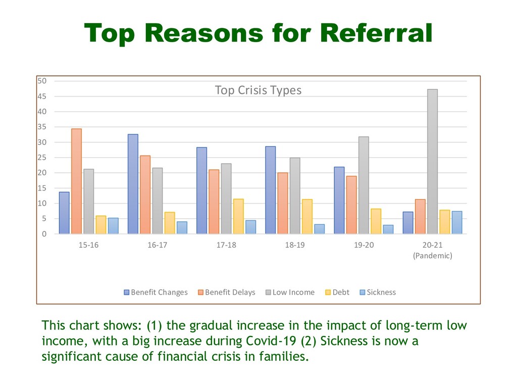 30 35 40 45 50 15-16 16-17 17-18 18-19 19-20 20-21 (Pandemic) Top Crisis Types Benefit Changes Benefit Delays Low Income Debt Sickness This chart shows: (1) the gradual increase in the impact of long-term low income, with a big increase during Covid-19 (2) Sickness is now a significant cause of financial crisis in families.