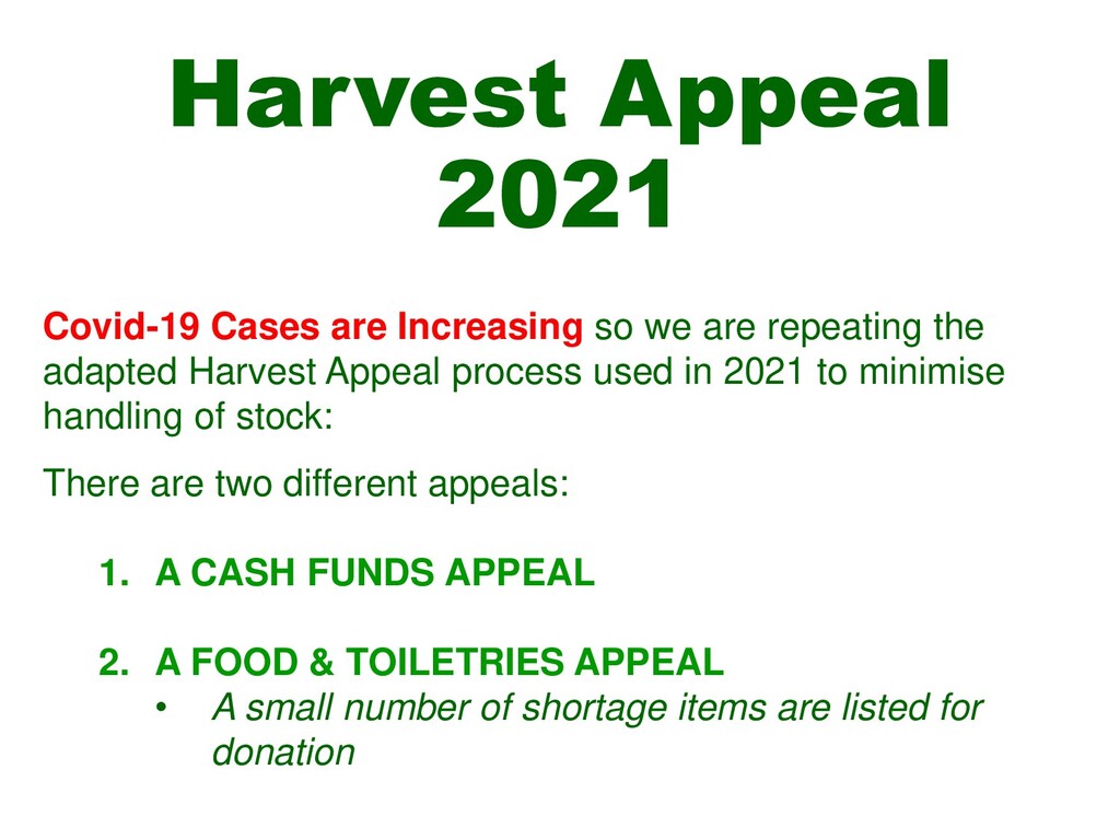repeating the adapted Harvest Appeal process used in 2021 to minimise handling of stock: There are two different appeals: 1. A CASH FUNDS APPEAL 2. A FOOD & TOILETRIES APPEAL • A small number of shortage items are listed for donation
