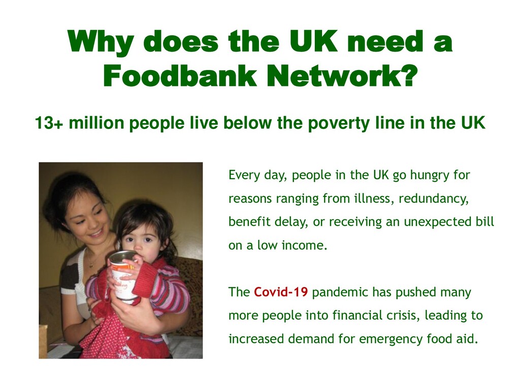 ranging from illness, redundancy, benefit delay, or receiving an unexpected bill on a low income. The Covid-19 pandemic has pushed many more people into financial crisis, leading to increased demand for emergency food aid. 13+ million people live below the poverty line in the UK Why does the UK need a Foodbank Network?