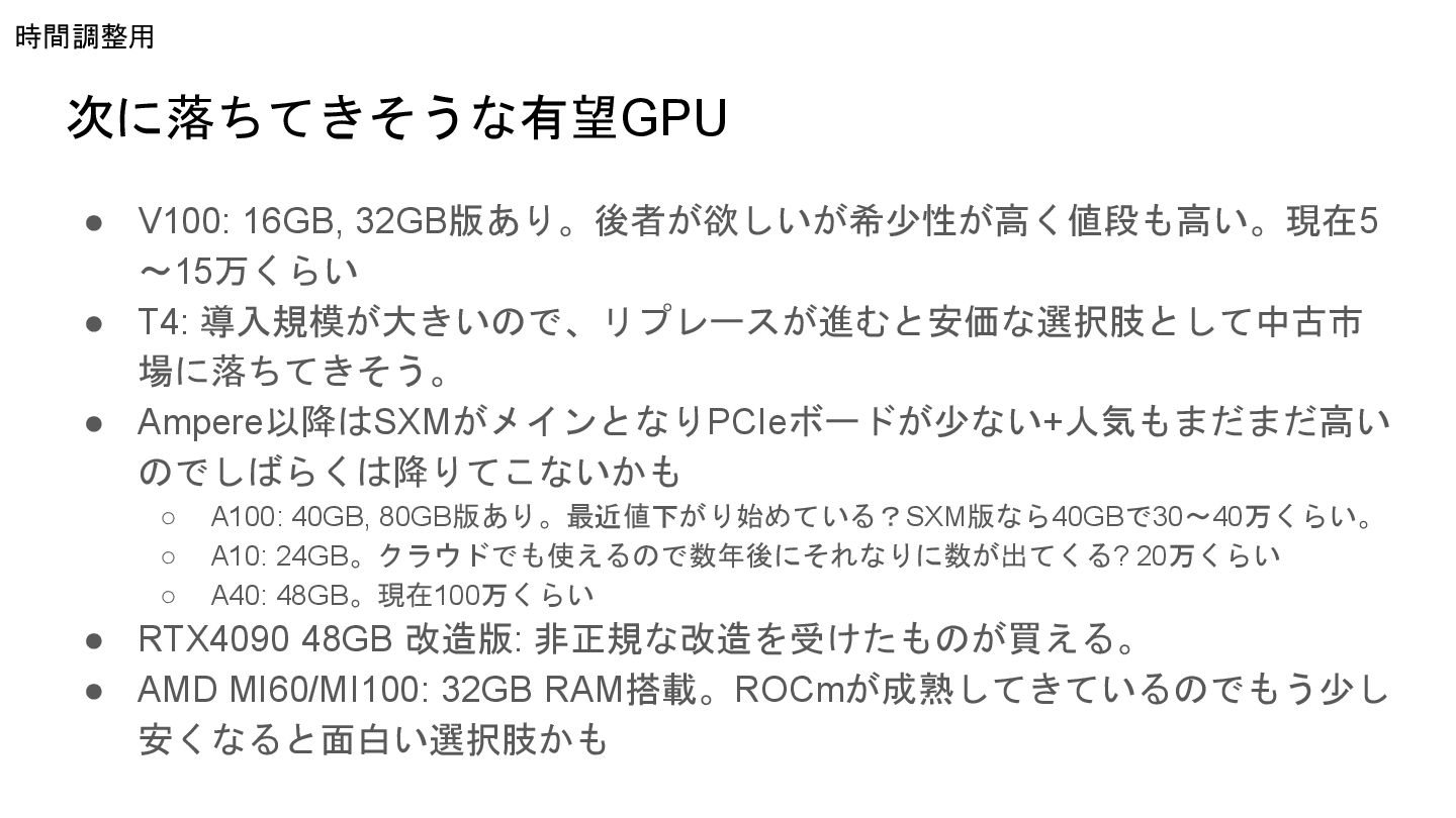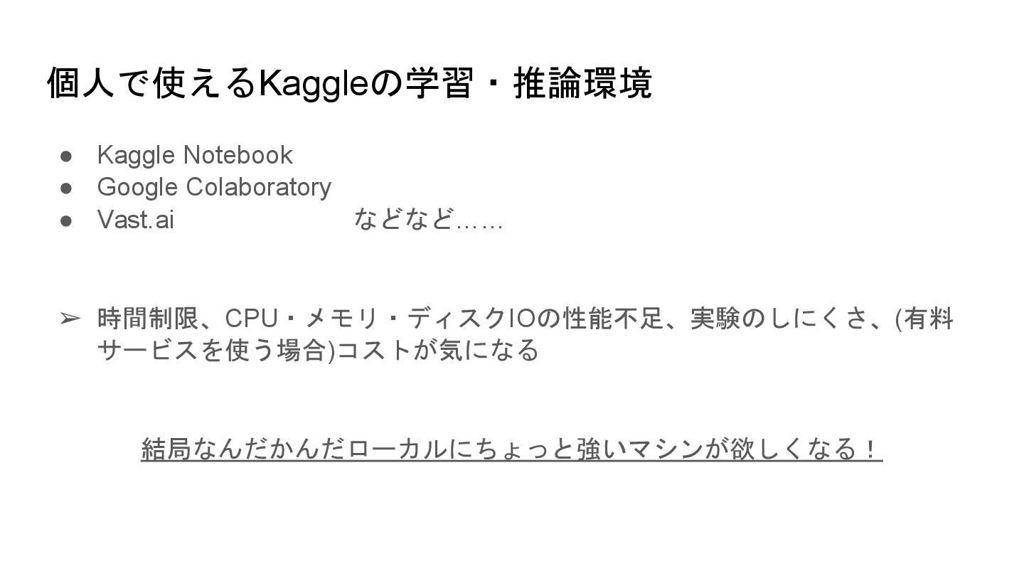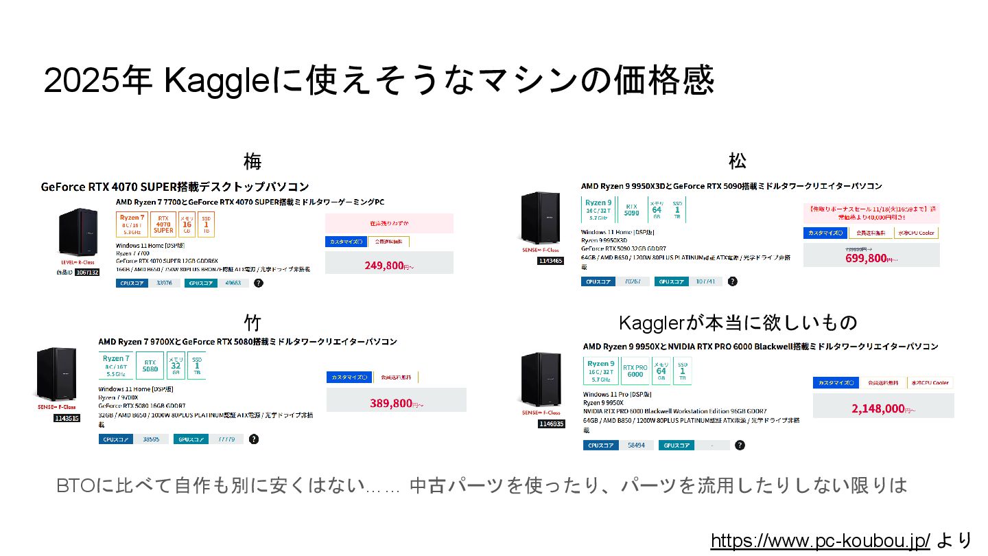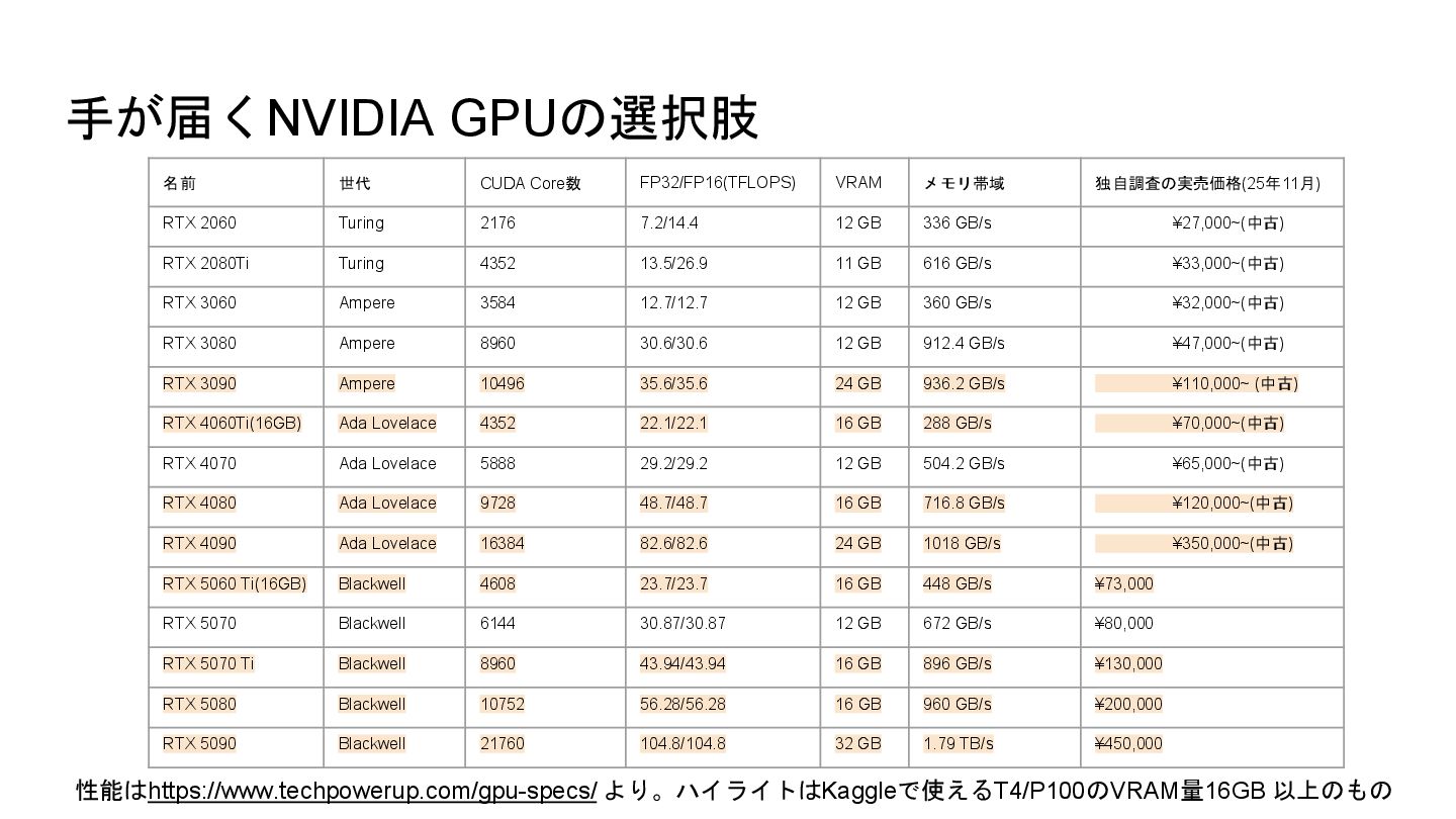 RTX 2060 Turing 2176 7.2/14.4 12 GB 336 GB/s ¥27,000~(中古) RTX 2080Ti Turing 4352 13.5/26.9 11 GB 616 GB/s ¥33,000~(中古) RTX 3060 Ampere 3584 12.7/12.7 12 GB 360 GB/s ¥32,000~(中古) RTX 3080 Ampere 8960 30.6/30.6 12 GB 912.4 GB/s ¥47,000~(中古) RTX 3090 Ampere 10496 35.6/35.6 24 GB 936.2 GB/s ¥110,000~ (中古) RTX 4060Ti(16GB) Ada Lovelace 4352 22.1/22.1 16 GB 288 GB/s ¥70,000~(中古) RTX 4070 Ada Lovelace 5888 29.2/29.2 12 GB 504.2 GB/s ¥65,000~(中古) RTX 4080 Ada Lovelace 9728 48.7/48.7 16 GB 716.8 GB/s ¥120,000~(中古) RTX 4090 Ada Lovelace 16384 82.6/82.6 24 GB 1018 GB/s ¥350,000~(中古) RTX 5060 Ti(16GB) Blackwell 4608 23.7/23.7 16 GB 448 GB/s ¥73,000 RTX 5070 Blackwell 6144 30.87/30.87 12 GB 672 GB/s ¥80,000 RTX 5070 Ti Blackwell 8960 43.94/43.94 16 GB 896 GB/s ¥130,000 RTX 5080 Blackwell 10752 56.28/56.28 16 GB 960 GB/s ¥200,000 RTX 5090 Blackwell 21760 104.8/104.8 32 GB 1.79 TB/s ¥450,000 性能はhttps://www.techpowerup.com/gpu-specs/ より。ハイライトはKaggleで使えるT4/P100のVRAM量16GB 以上のもの