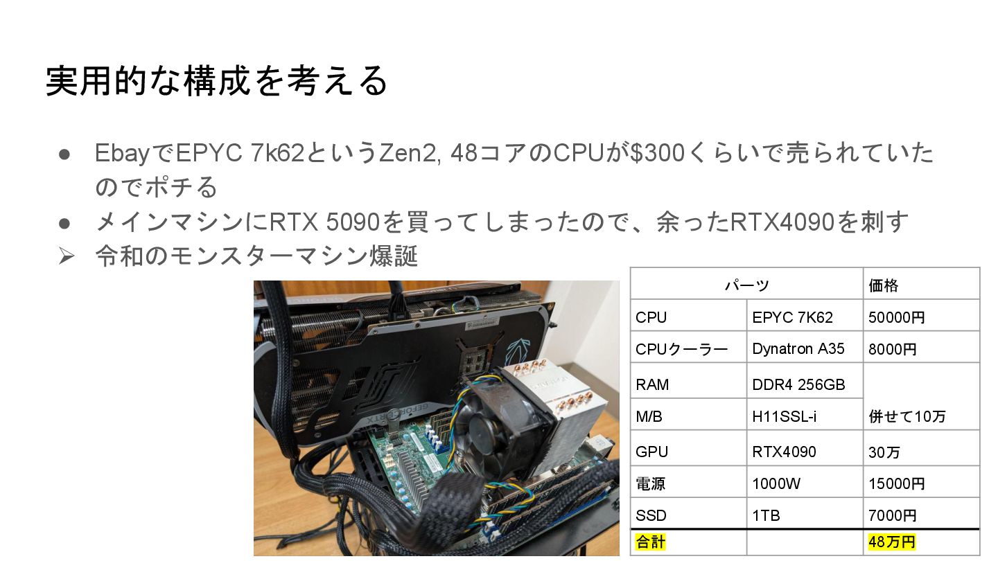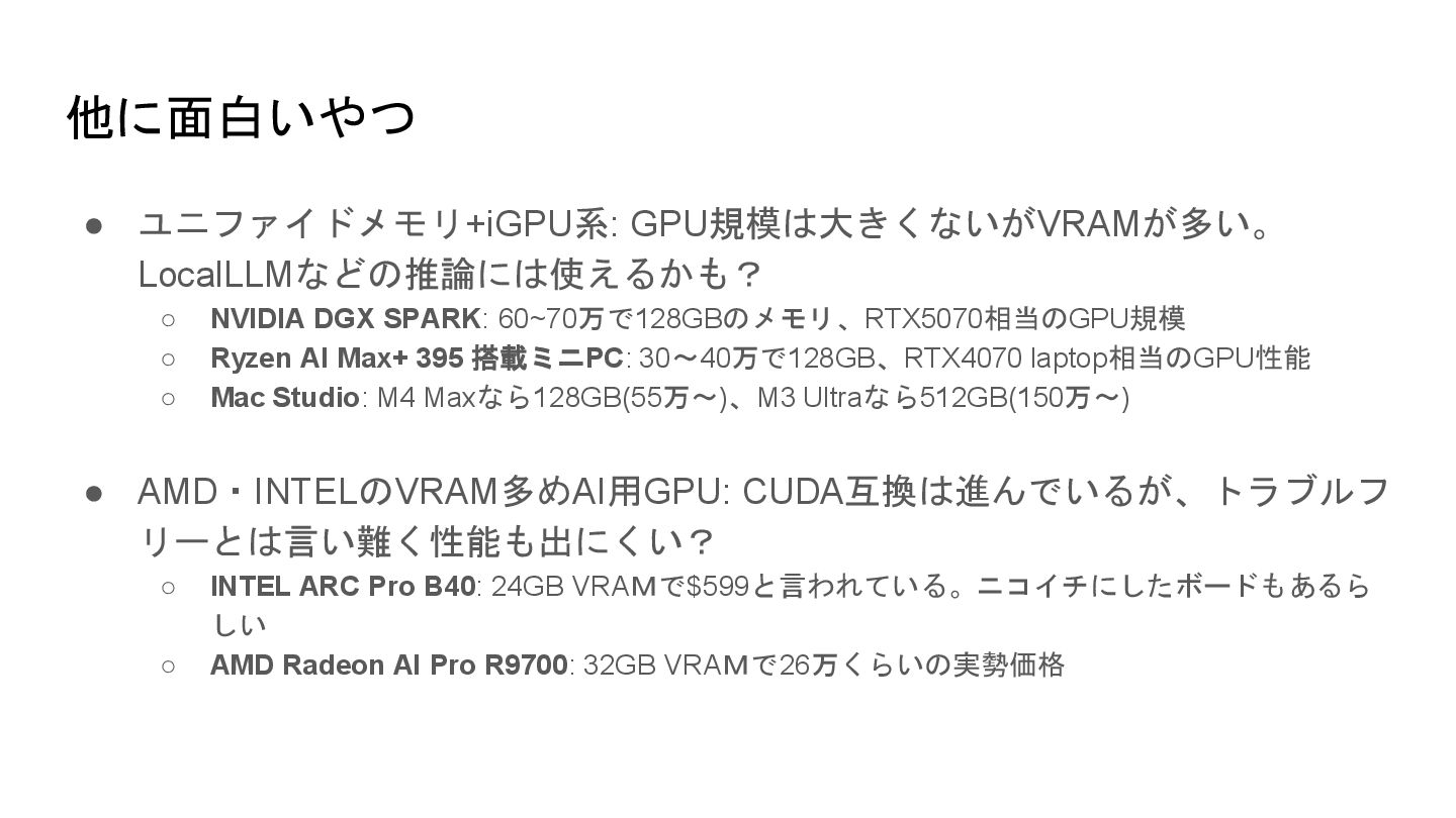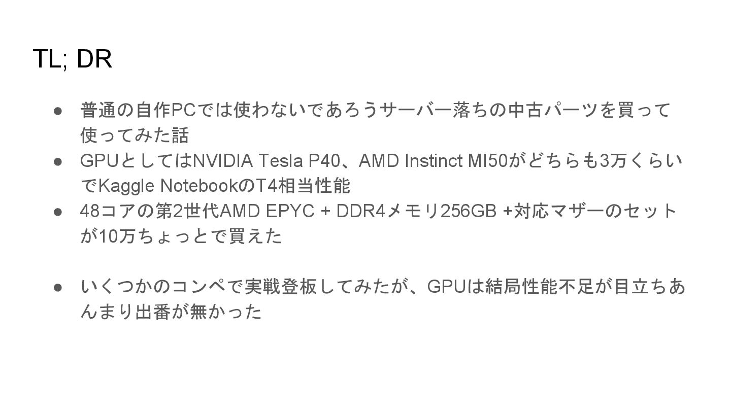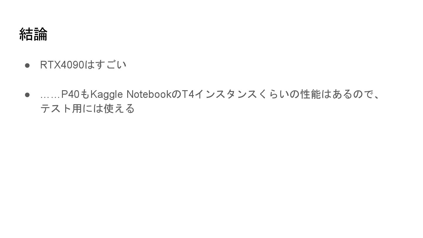 RTX 2060 Turing 2176 7.2/14.4 12 GB 336 GB/s ¥27,000~(中古) RTX 2080Ti Turing 4352 13.5/26.9 11 GB 616 GB/s ¥33,000~(中古) RTX 3060 Ampere 3584 12.7/12.7 12 GB 360 GB/s ¥32,000~(中古) RTX 3080 Ampere 8960 30.6/30.6 12 GB 912.4 GB/s ¥47,000~(中古) RTX 3090 Ampere 10496 35.6/35.6 24 GB 936.2 GB/s ¥110,000~ (中古) RTX 4060Ti(16GB) Ada Lovelace 4352 22.1/22.1 16 GB 288 GB/s ¥70,000~(中古) RTX 4070 Ada Lovelace 5888 29.2/29.2 12 GB 504.2 GB/s ¥65,000~(中古) RTX 4080 Ada Lovelace 9728 48.7/48.7 16 GB 716.8 GB/s ¥120,000~(中古) RTX 4090 Ada Lovelace 16384 82.6/82.6 24 GB 1018 GB/s ¥350,000~(中古) RTX 5060 Ti(16GB) Blackwell 4608 23.7/23.7 16 GB 448 GB/s ¥73,000 RTX 5070 Blackwell 6144 30.87/30.87 12 GB 672 GB/s ¥80,000 RTX 5070 Ti Blackwell 8960 43.94/43.94 16 GB 896 GB/s ¥130,000 RTX 5080 Blackwell 10752 56.28/56.28 16 GB 960 GB/s ¥200,000 RTX 5090 Blackwell 21760 104.8/104.8 32 GB 1.79 TB/s ¥450,000 性能はhttps://www.techpowerup.com/gpu-specs/ より。ハイライトはKaggleで使えるT4/P100のVRAM量16GB 以上のもの