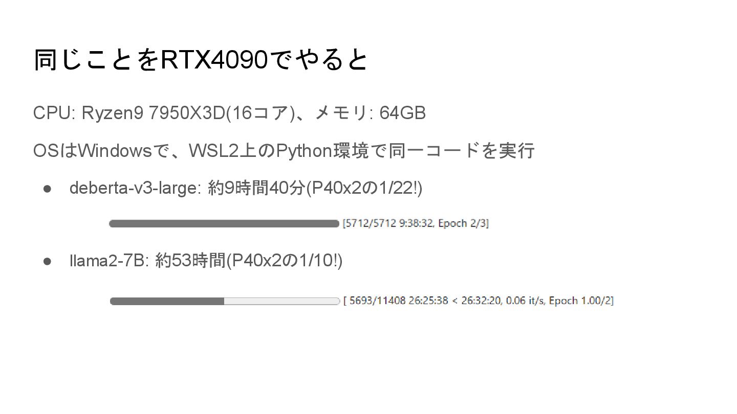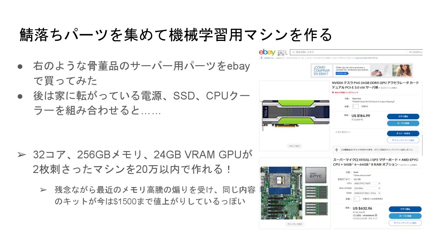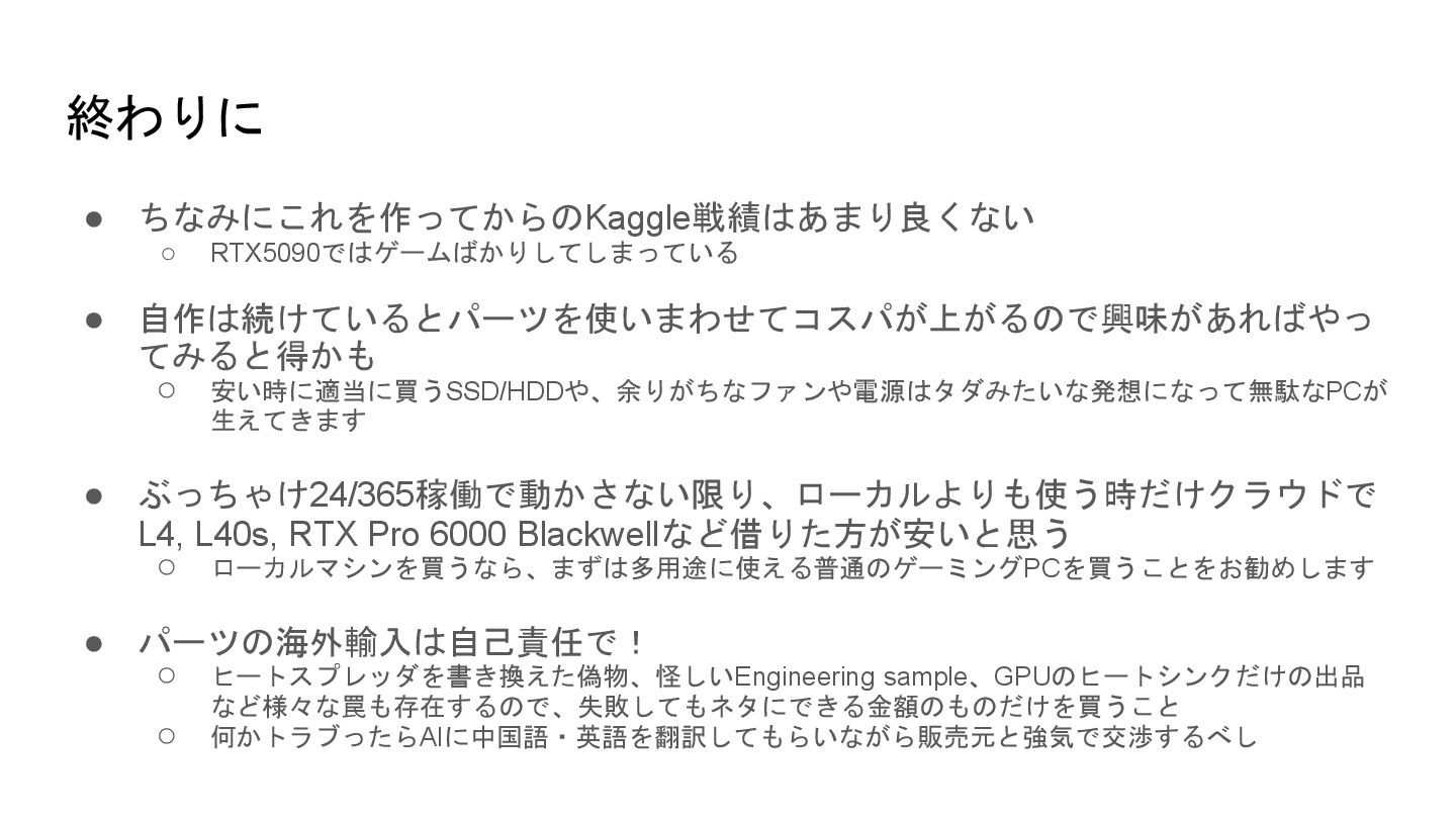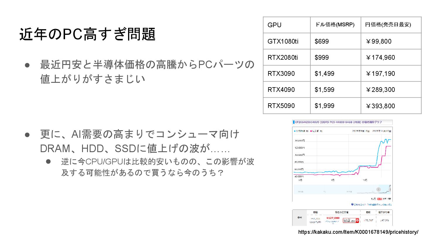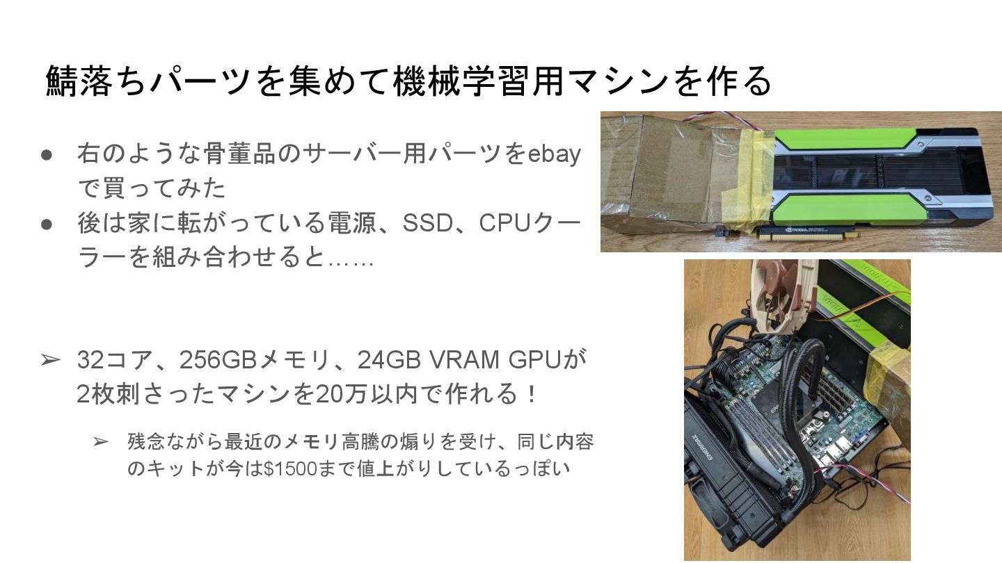 RTX 2060 Turing 2176 7.2/14.4 12 GB 336 GB/s ¥27,000~(中古) RTX 2080Ti Turing 4352 13.5/26.9 11 GB 616 GB/s ¥33,000~(中古) RTX 3060 Ampere 3584 12.7/12.7 12 GB 360 GB/s ¥32,000~(中古) RTX 3080 Ampere 8960 30.6/30.6 12 GB 912.4 GB/s ¥47,000~(中古) RTX 3090 Ampere 10496 35.6/35.6 24 GB 936.2 GB/s ¥110,000~ (中古) RTX 4060Ti(16GB) Ada Lovelace 4352 22.1/22.1 16 GB 288 GB/s ¥70,000~(中古) RTX 4070 Ada Lovelace 5888 29.2/29.2 12 GB 504.2 GB/s ¥65,000~(中古) RTX 4080 Ada Lovelace 9728 48.7/48.7 16 GB 716.8 GB/s ¥120,000~(中古) RTX 4090 Ada Lovelace 16384 82.6/82.6 24 GB 1018 GB/s ¥350,000~(中古) RTX 5060 Ti(16GB) Blackwell 4608 23.7/23.7 16 GB 448 GB/s ¥73,000 RTX 5070 Blackwell 6144 30.87/30.87 12 GB 672 GB/s ¥80,000 RTX 5070 Ti Blackwell 8960 43.94/43.94 16 GB 896 GB/s ¥130,000 RTX 5080 Blackwell 10752 56.28/56.28 16 GB 960 GB/s ¥200,000 RTX 5090 Blackwell 21760 104.8/104.8 32 GB 1.79 TB/s ¥450,000 性能はhttps://www.techpowerup.com/gpu-specs/ より。ハイライトはKaggleで使えるT4/P100のVRAM量16GB 以上のもの