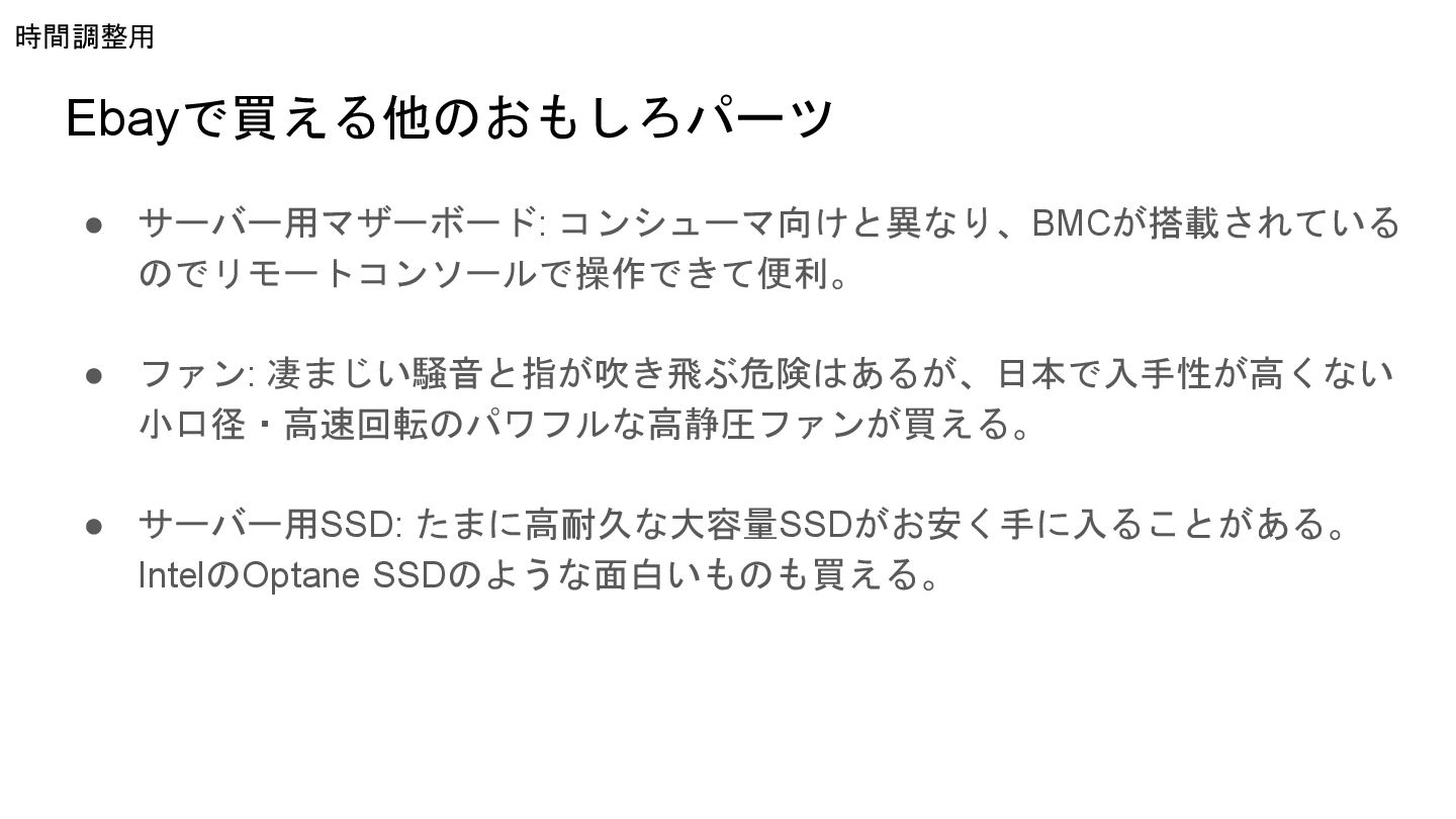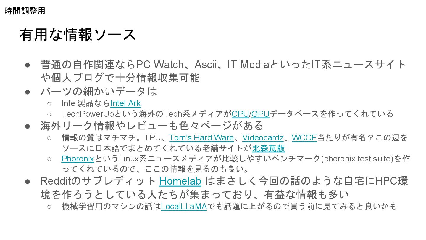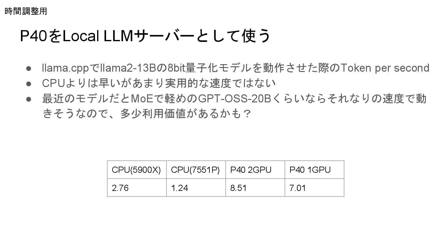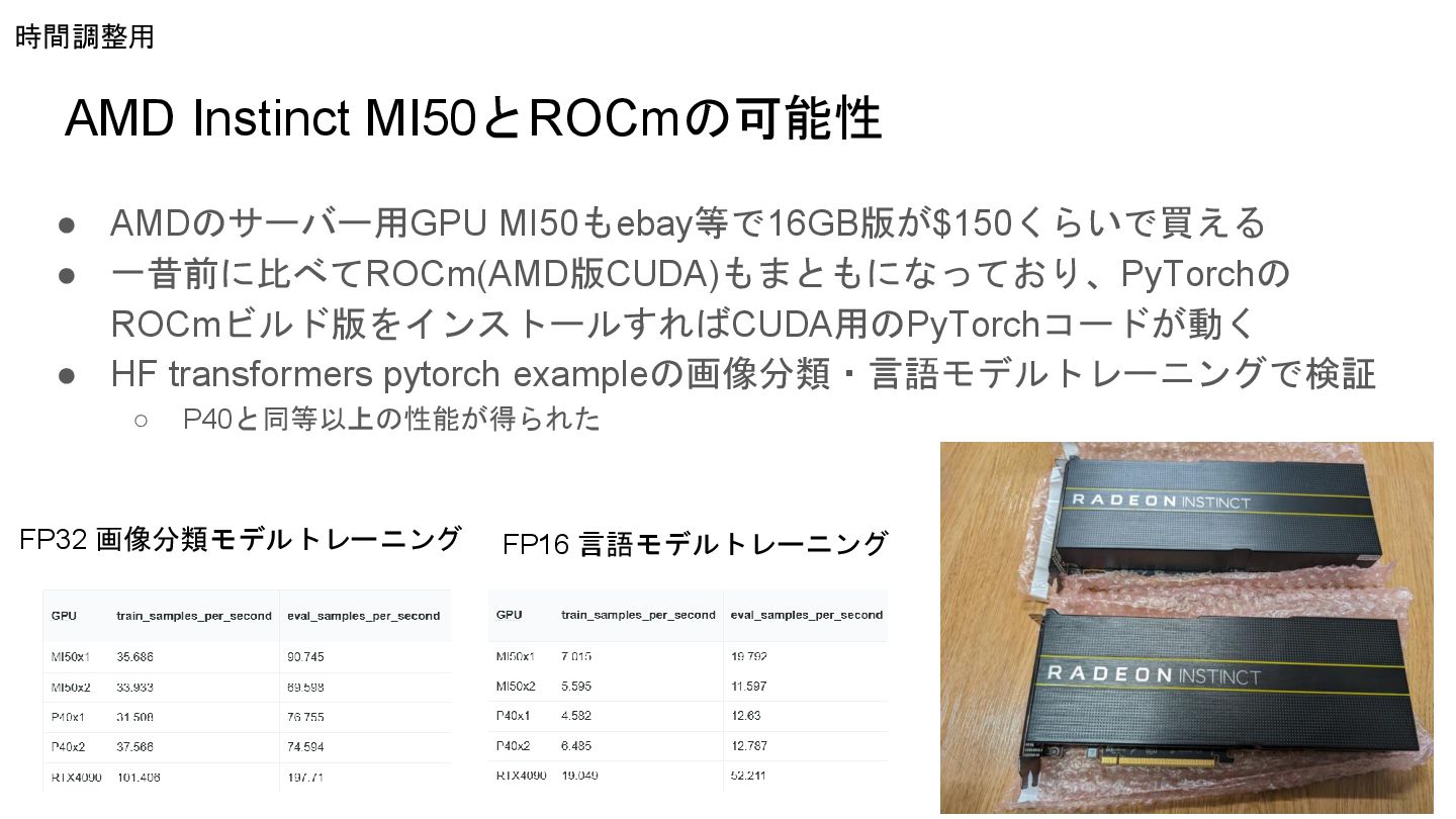 RTX 2060 Turing 2176 7.2/14.4 12 GB 336 GB/s ¥27,000~(中古) RTX 2080Ti Turing 4352 13.5/26.9 11 GB 616 GB/s ¥33,000~(中古) RTX 3060 Ampere 3584 12.7/12.7 12 GB 360 GB/s ¥32,000~(中古) RTX 3080 Ampere 8960 30.6/30.6 12 GB 912.4 GB/s ¥47,000~(中古) RTX 3090 Ampere 10496 35.6/35.6 24 GB 936.2 GB/s ¥110,000~ (中古) RTX 4060Ti(16GB) Ada Lovelace 4352 22.1/22.1 16 GB 288 GB/s ¥70,000~(中古) RTX 4070 Ada Lovelace 5888 29.2/29.2 12 GB 504.2 GB/s ¥65,000~(中古) RTX 4080 Ada Lovelace 9728 48.7/48.7 16 GB 716.8 GB/s ¥120,000~(中古) RTX 4090 Ada Lovelace 16384 82.6/82.6 24 GB 1018 GB/s ¥350,000~(中古) RTX 5060 Ti(16GB) Blackwell 4608 23.7/23.7 16 GB 448 GB/s ¥73,000 RTX 5070 Blackwell 6144 30.87/30.87 12 GB 672 GB/s ¥80,000 RTX 5070 Ti Blackwell 8960 43.94/43.94 16 GB 896 GB/s ¥130,000 RTX 5080 Blackwell 10752 56.28/56.28 16 GB 960 GB/s ¥200,000 RTX 5090 Blackwell 21760 104.8/104.8 32 GB 1.79 TB/s ¥450,000 性能はhttps://www.techpowerup.com/gpu-specs/ より。ハイライトはKaggleで使えるT4/P100のVRAM量16GB 以上のもの