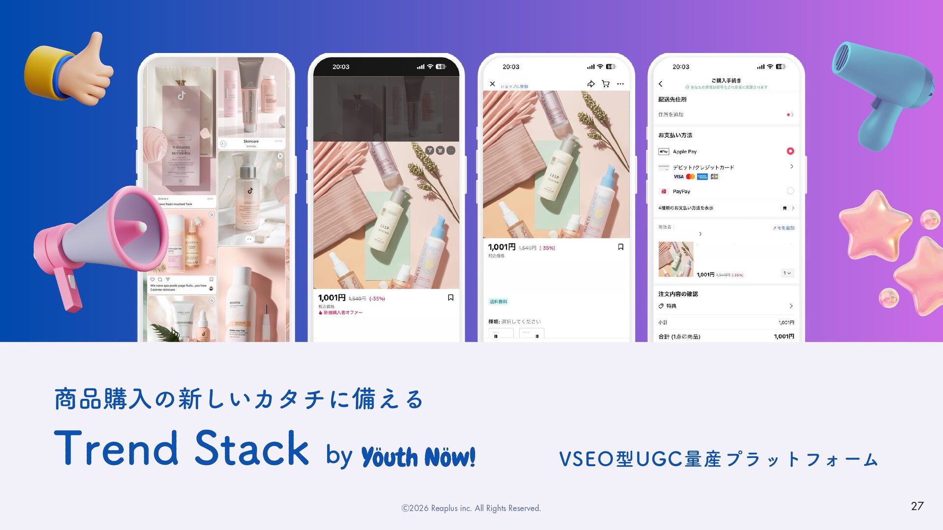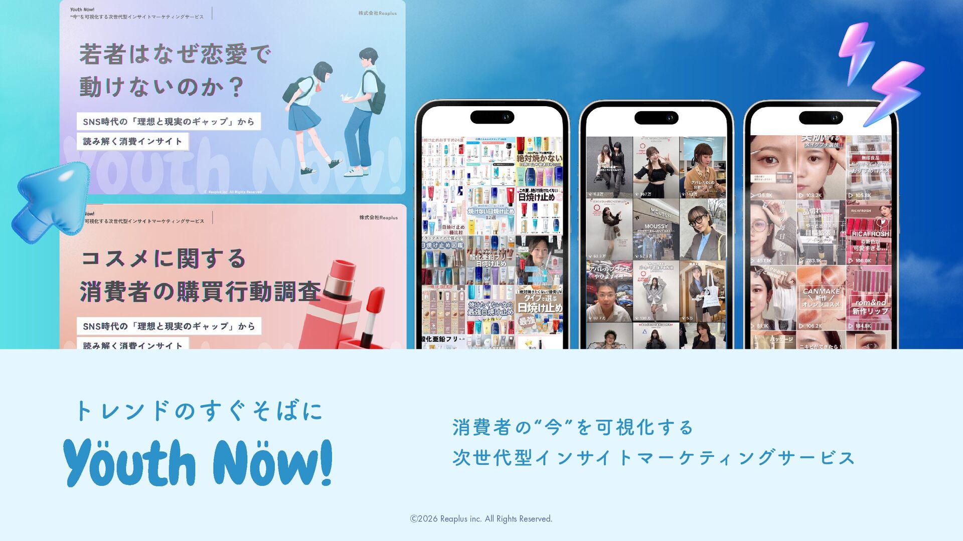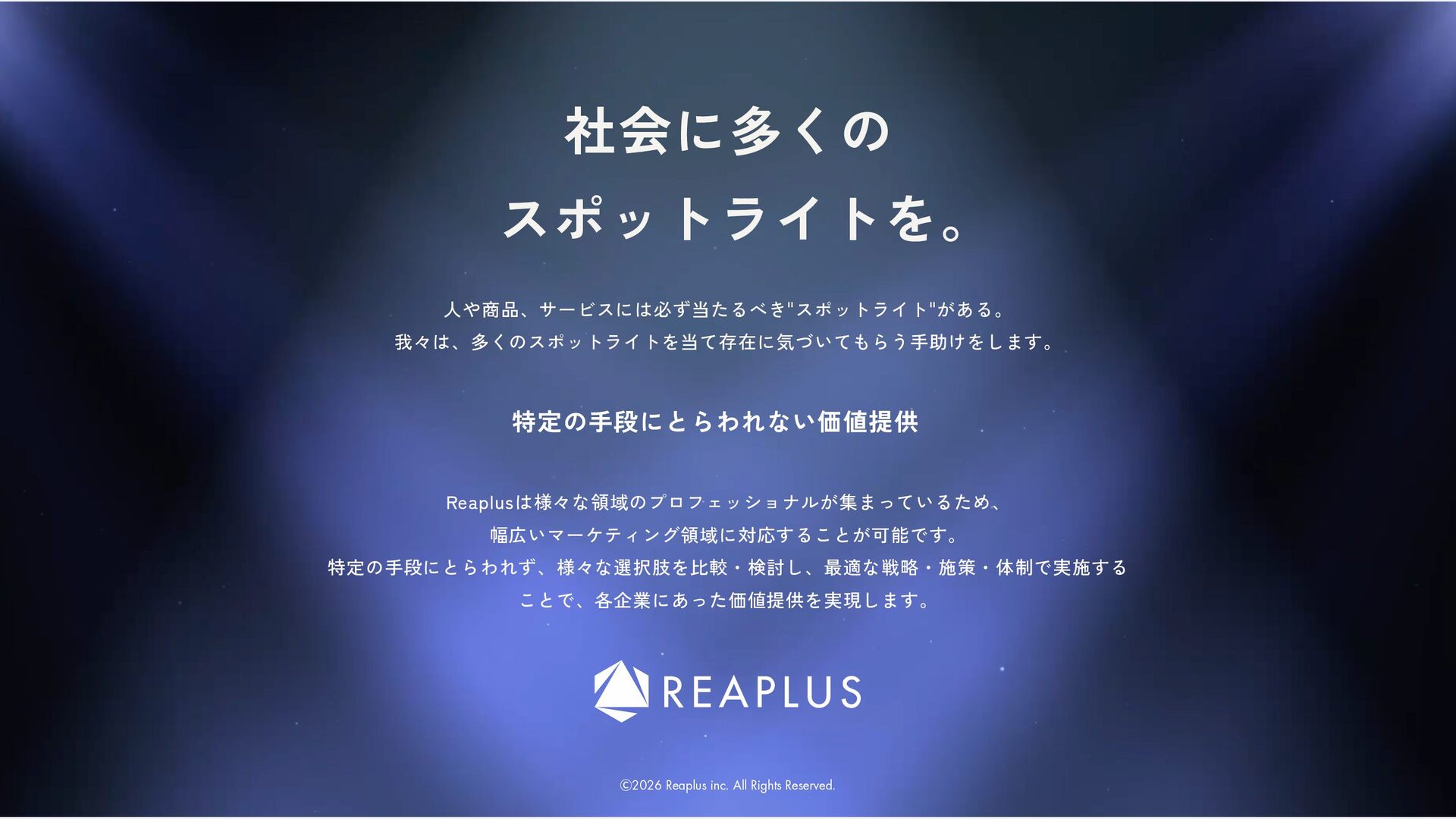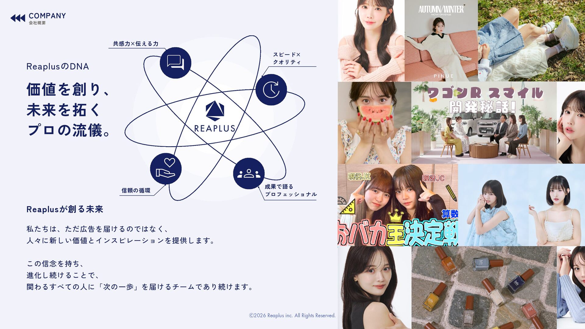 共感力×伝える力 私たちは、ただ広告を届けるのではなく、 人々に新しい価値とインスピレーションを提供します。 この信念を持ち、 進化し続けることで、 関わるすべての人に「次の一歩」を届けるチームであり続けます。 COMPANY 会社概要 Ⓒ2026 Reaplus inc. All Rights Reserved.