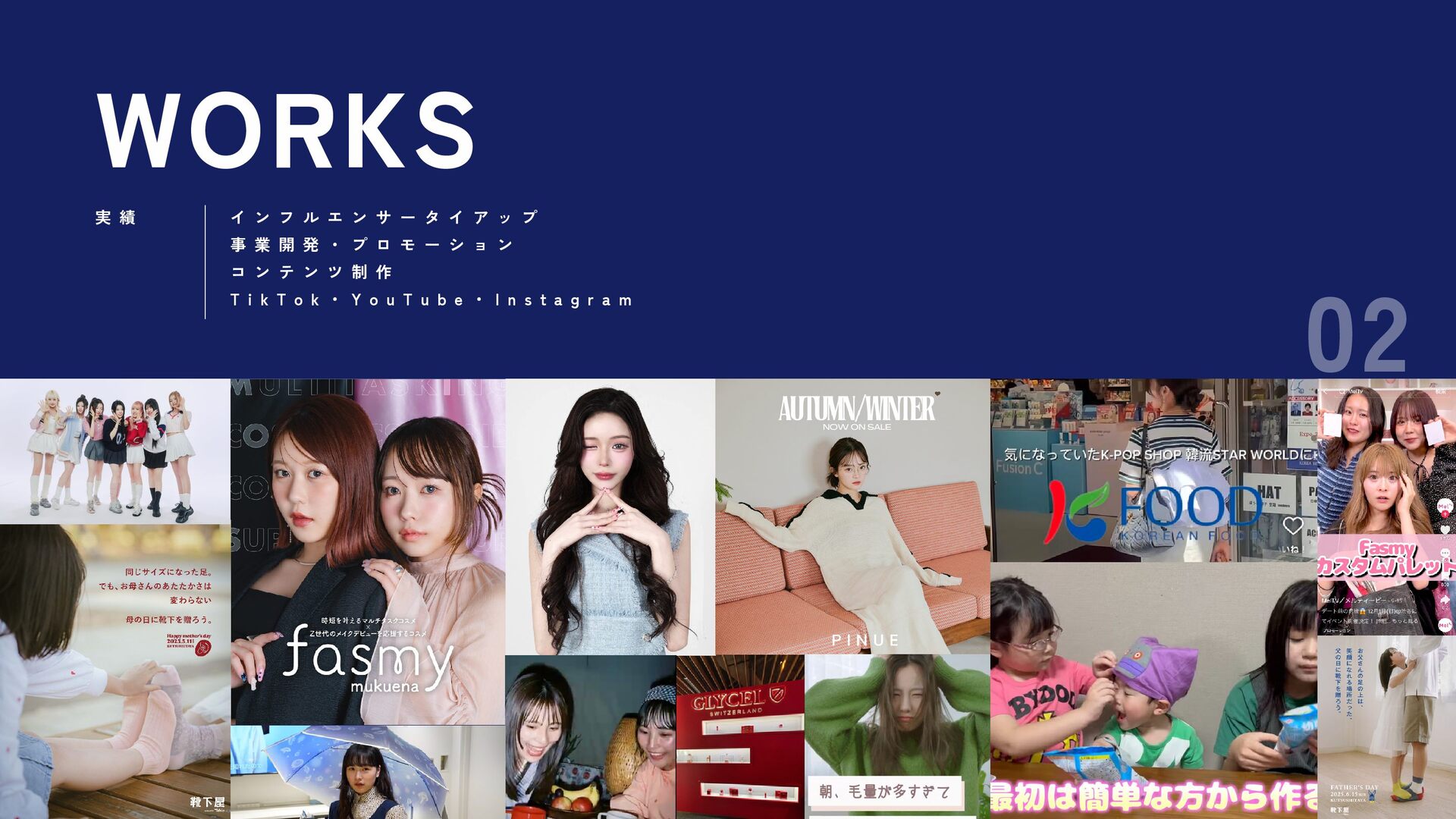 ー タ イ ア ッ プ 事 業 開 発 ・ プ ロ モ ー シ ョ ン コ ン テ ン ツ 制 作 T i k T o k ・ Y o u T u b e ・ I n s t a g r a m 02