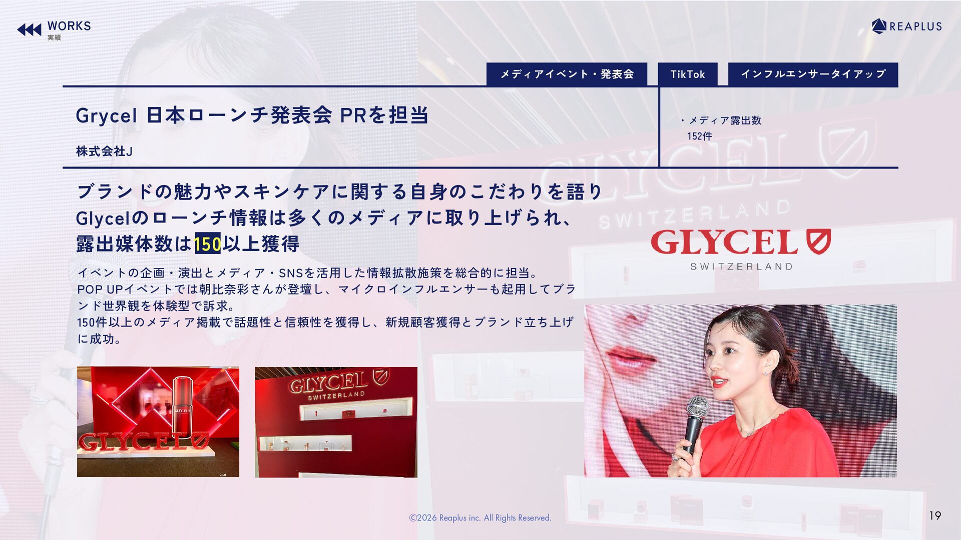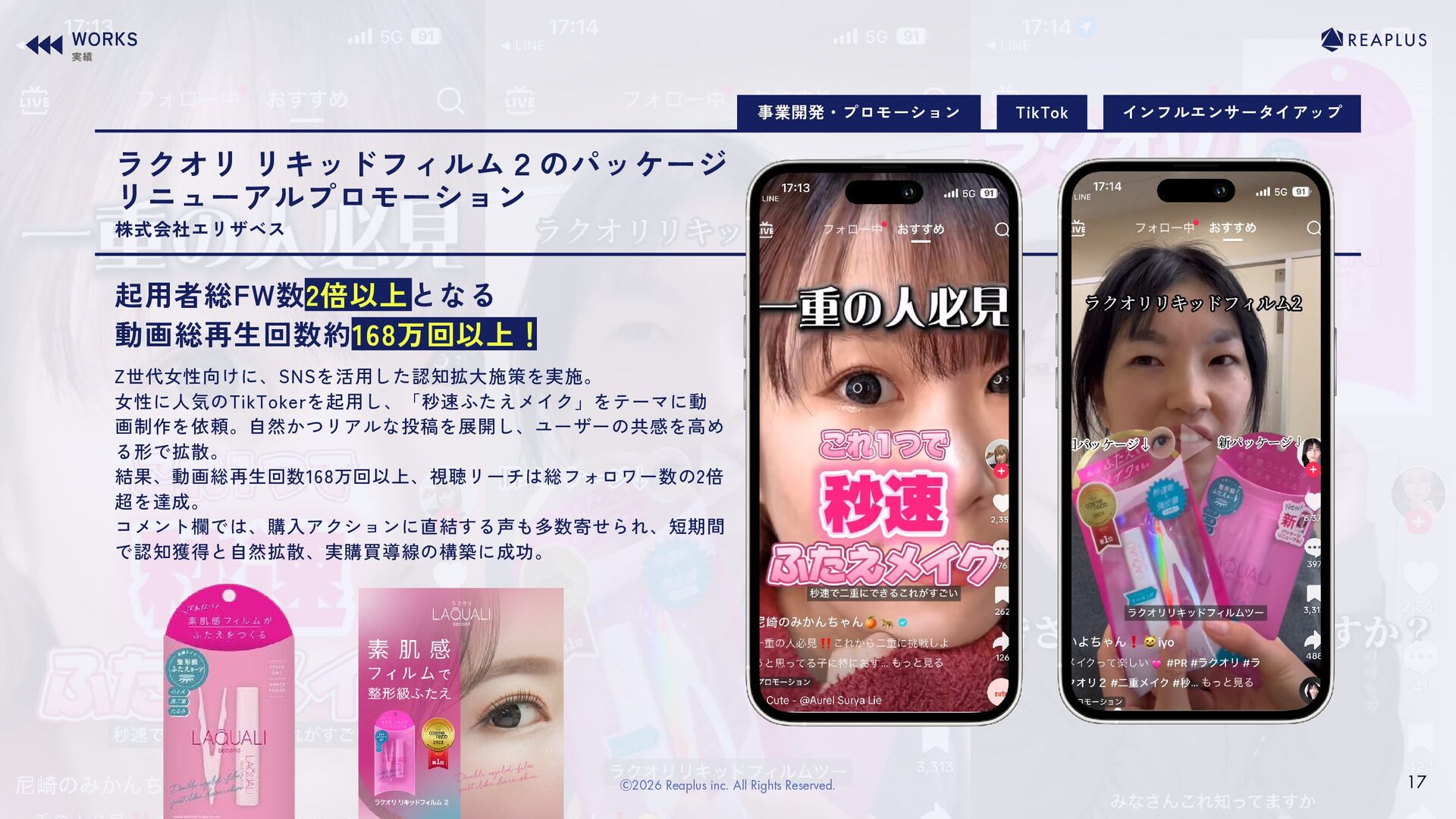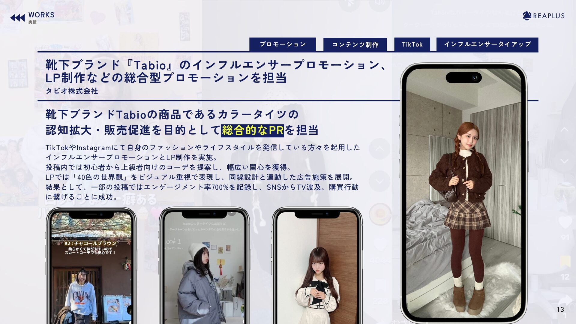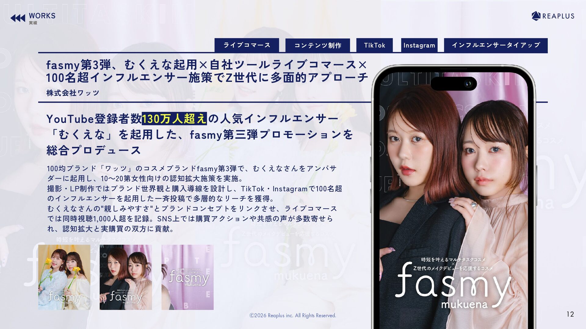 のインフルエンサーを起用した一斉投稿で多層的なリーチを獲得。 むくえなさんの"親しみやすさ"とブランドコンセプトをリンクさせ、ライブコマース では同時視聴1,000人超を記録。SNS上では購買アクションや共感の声が多数寄せら れ、認知拡大と実購買の双方に貢献。 株式会社ワッツ TikTok ライブコマース Instagram コンテンツ制作 WORKS 実績 12 Ⓒ2026 Reaplus inc. All Rights Reserved.