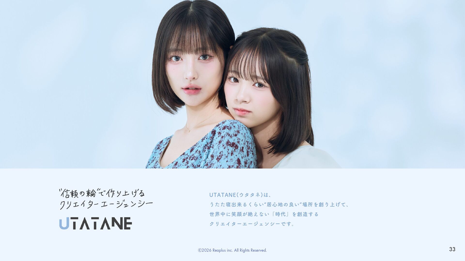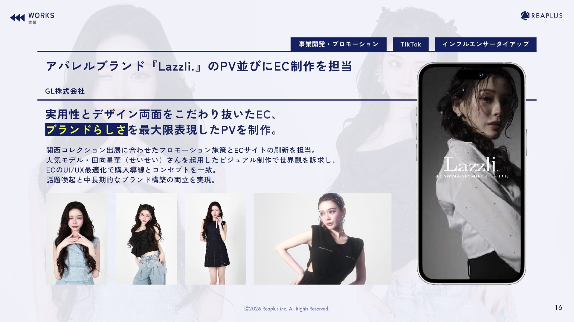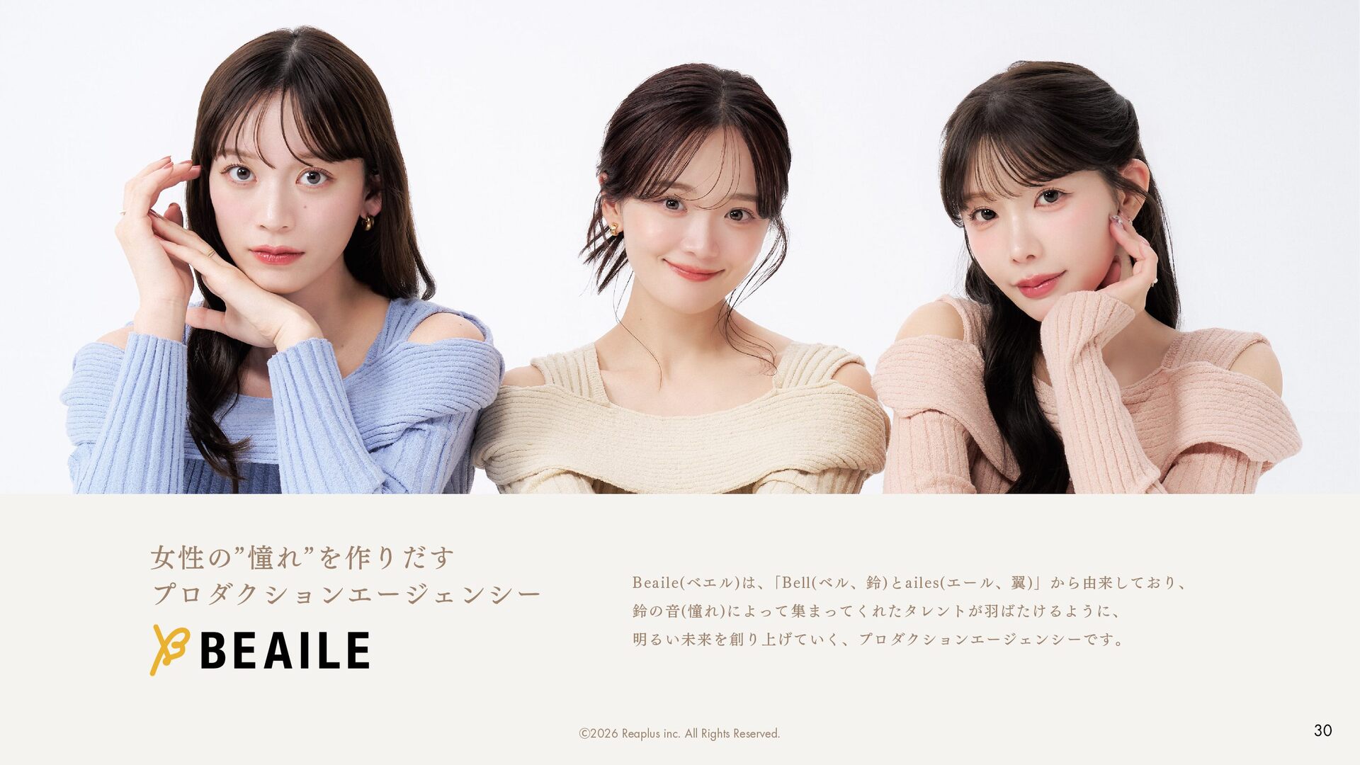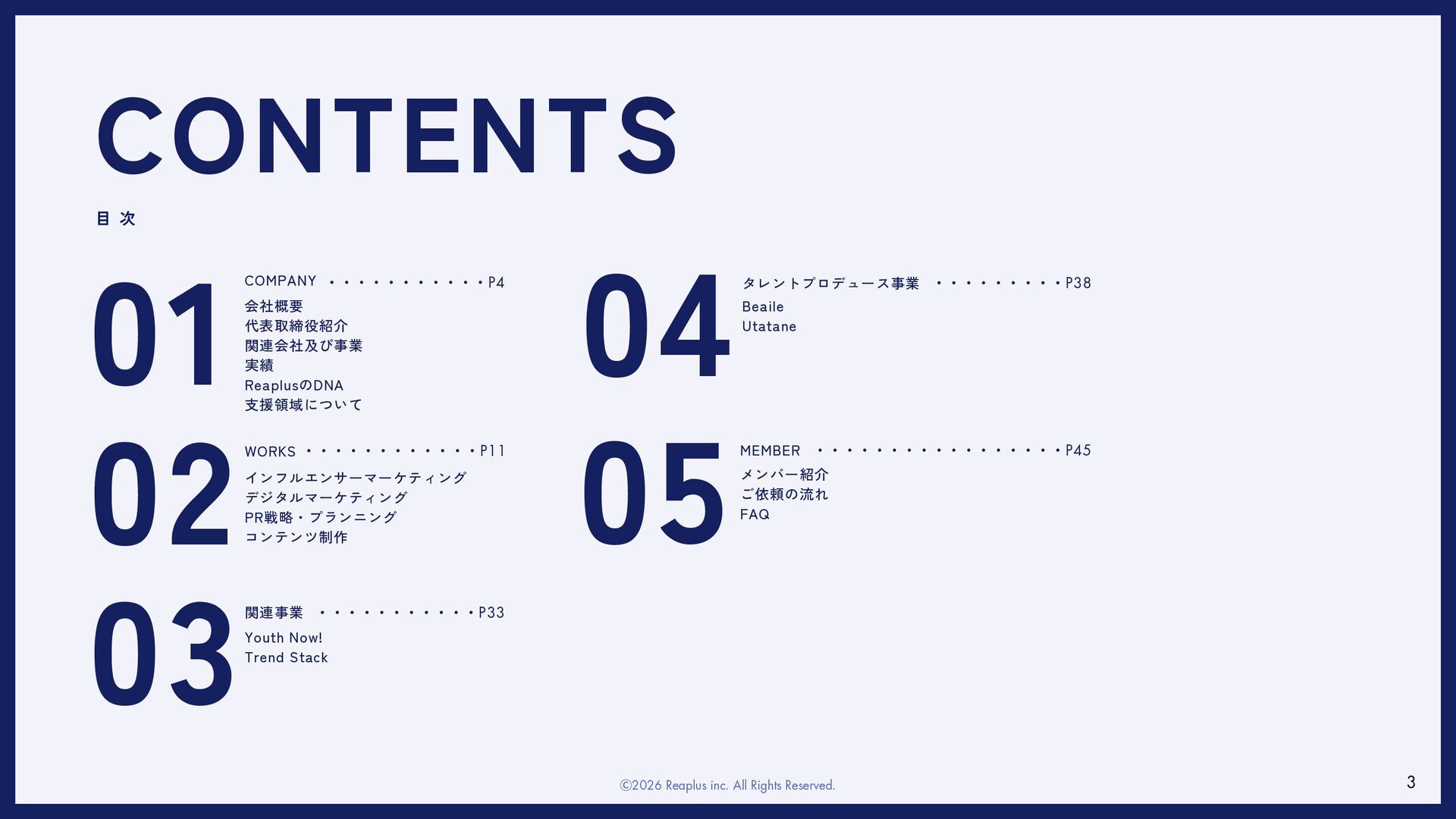 ReaplusのDNA 支援領域について COMPANY 関連事業 WORKS MEMBER ・・・・・・・・・・・P4 ・・・・・・・・・・・・P11 ・・・・・・・・・・・・・・・・・P45 ・・・・・・・・・・・P33 Youth Now! Trend Stack インフルエンサーマーケティング デジタルマーケティング PR戦略・プランニング コンテンツ制作 CONTENTS 04タレントプロデュース事業 ・・・・・・・・・P38 Ⓒ2026 Reaplus inc. All Rights Reserved. 3 Beaile Utatane メンバー紹介 ご依頼の流れ FAQ
