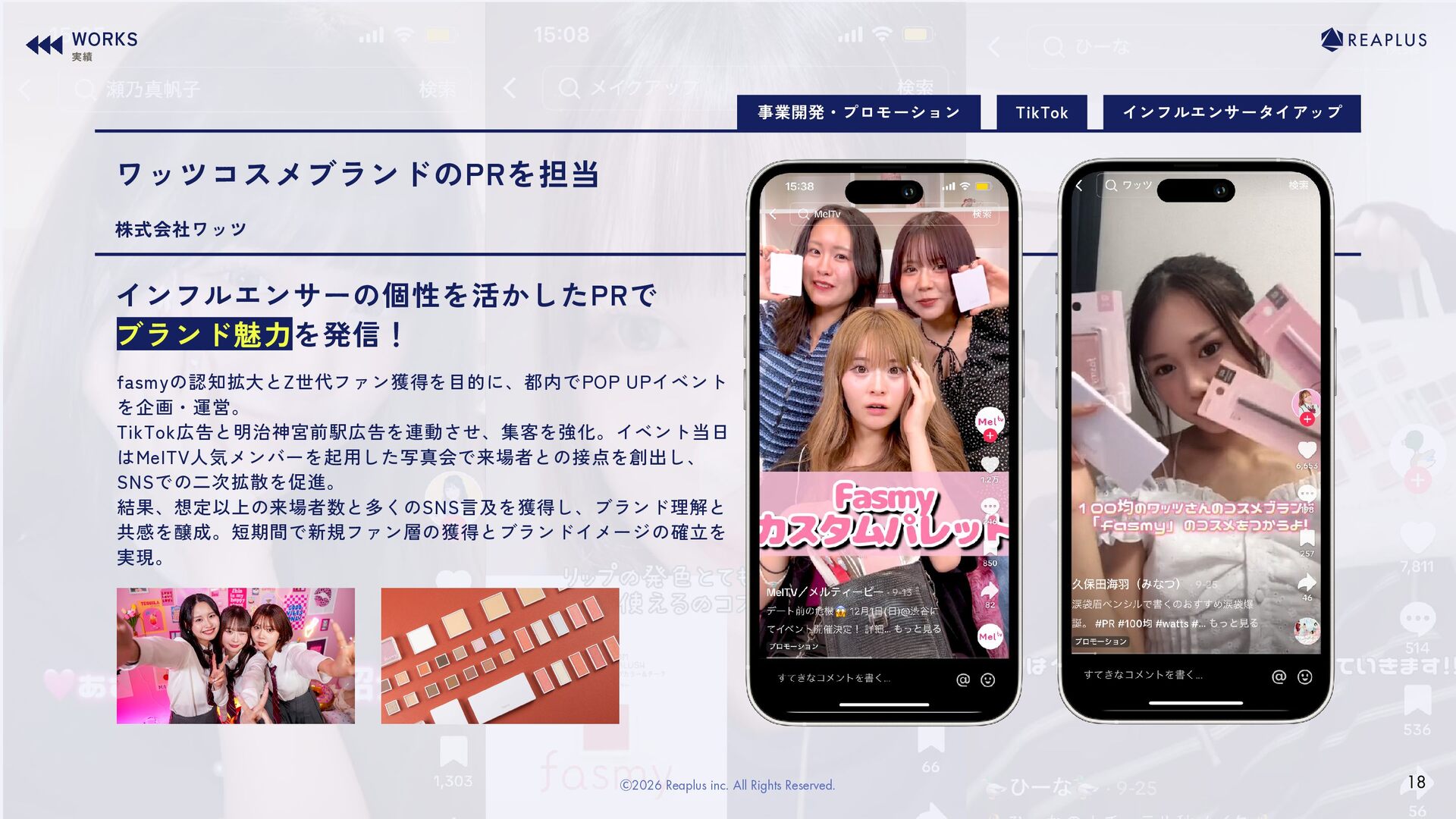 9. インフルエンサータイアップ fasmy第3弾、むくえな起用×自社ツールライブコマース× 100名超インフルエンサー施策でZ世代に多面的アプローチ YouTube登録者数130万人超えの人気インフルエンサー 「むくえな」を起用した、fasmy第三弾プロモーションを 総合プロデュース 100均ブランド「ワッツ」のコスメブランドfasmy第3弾で、むくえなさんをアンバサ ダーに起用し、10 ~20第女性向けの認知拡大施策を実施。 撮影・LP制作ではブランド世界観と購入導線を設計し、TikTok・Instagramで100名超