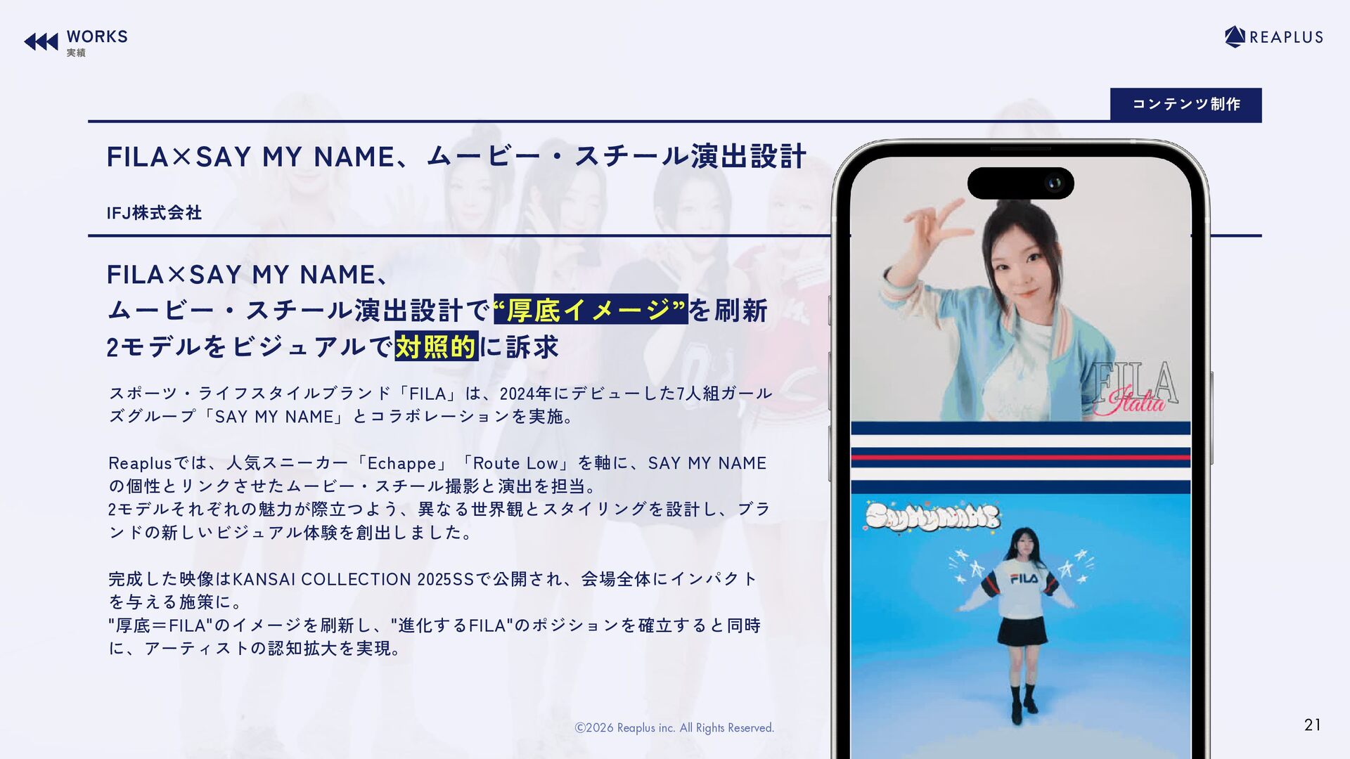 ズグループ「SAY MY NAME」とコラボレーションを実施。 Reaplusでは、人気スニーカー「Echappe」「Route Low」を軸に、SAY MY NAME の個性とリンクさせたムービー・スチール撮影と演出を担当。 2モデルそれぞれの魅力が際立つよう、異なる世界観とスタイリングを設計し、ブラ ンドの新しいビジュアル体験を創出しました。 完成した映像はKANSAI COLLECTION 2025SSで公開され、会場全体にインパクト を与える施策に。 "厚底=FILA"のイメージを刷新し、"進化するFILA"のポジションを確立すると同時 に、アーティストの認知拡大を実現。 IFJ株式会社  WORKS 実績 21 Ⓒ2026 Reaplus inc. All Rights Reserved.